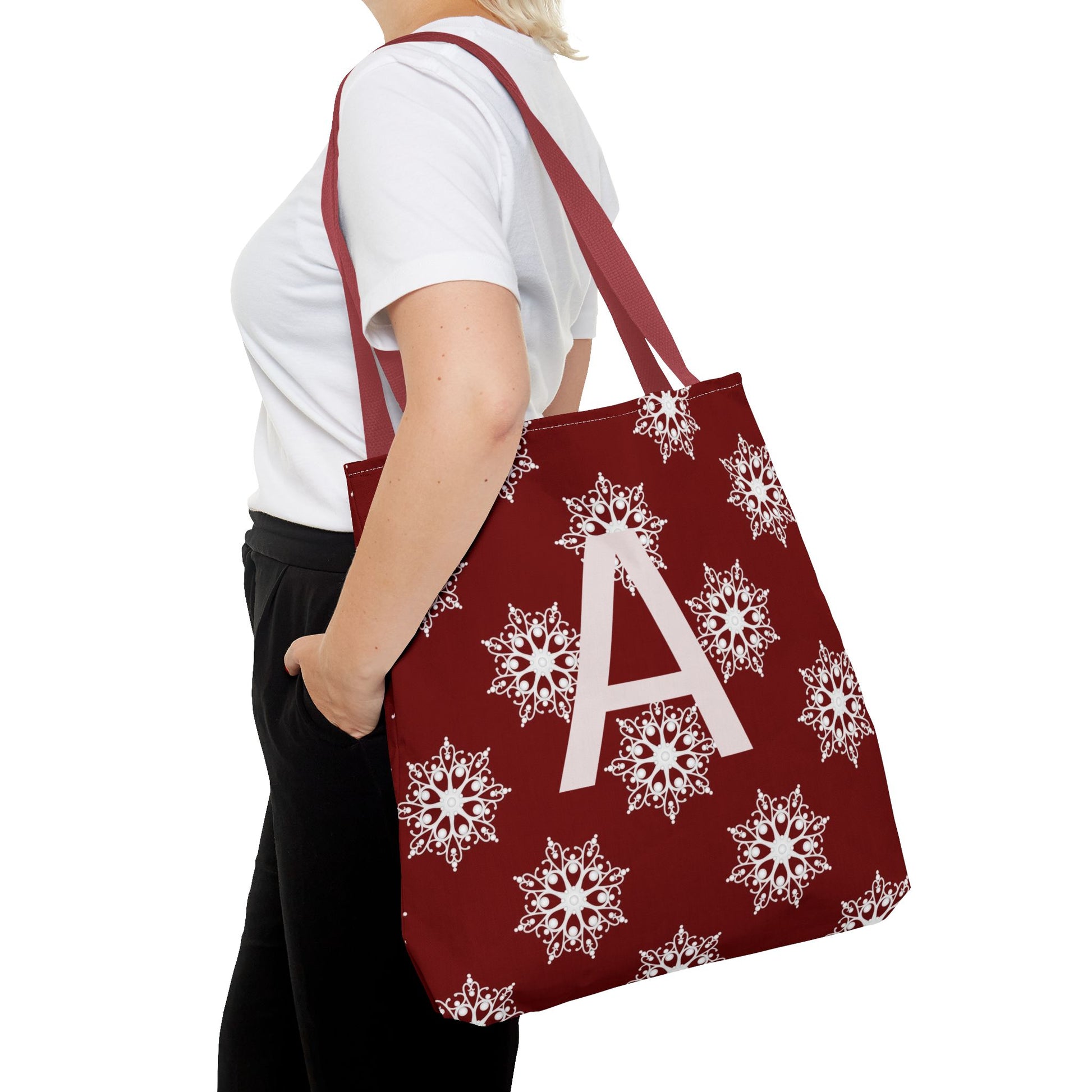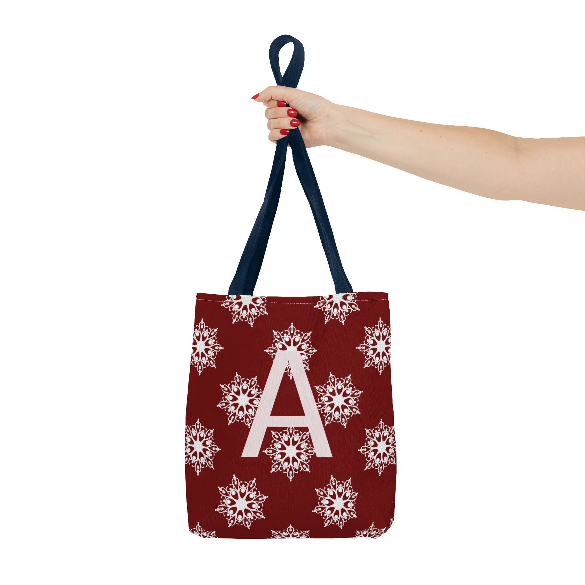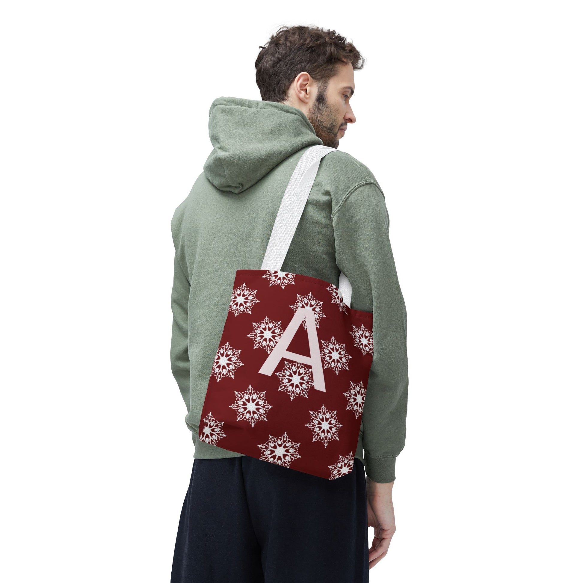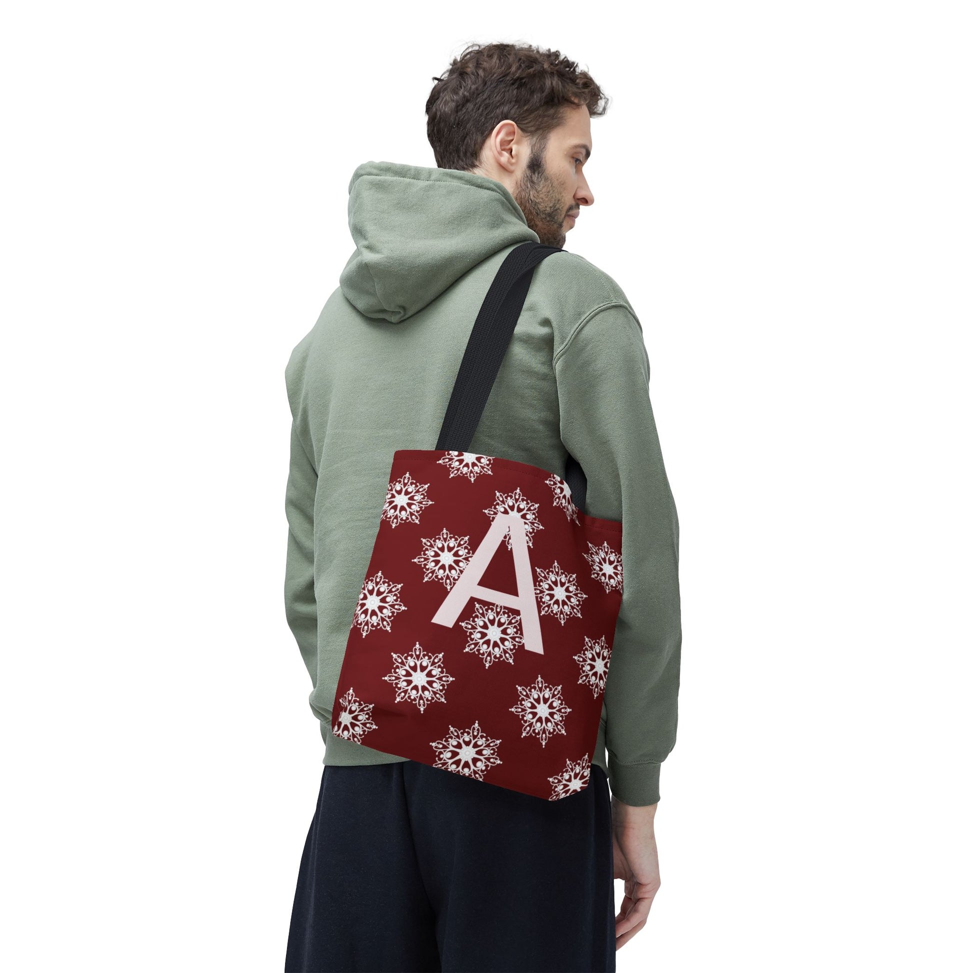 Monogram A Snowflake Tote Bag — Personalized Holiday AOP Tote