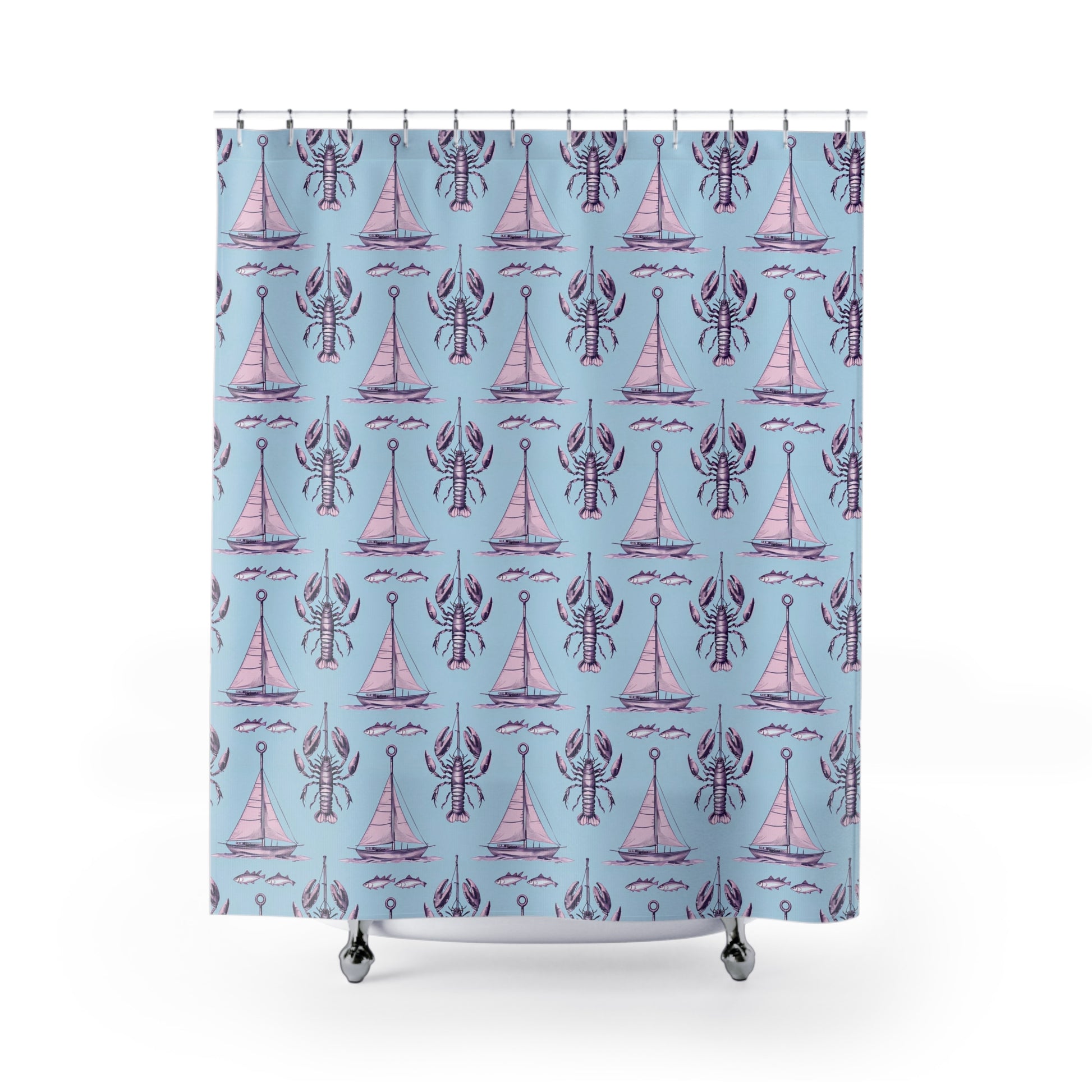 Nautical Lobster & Sailboat Shower Curtain — Pastel Blue Coastal Bathroom Decor