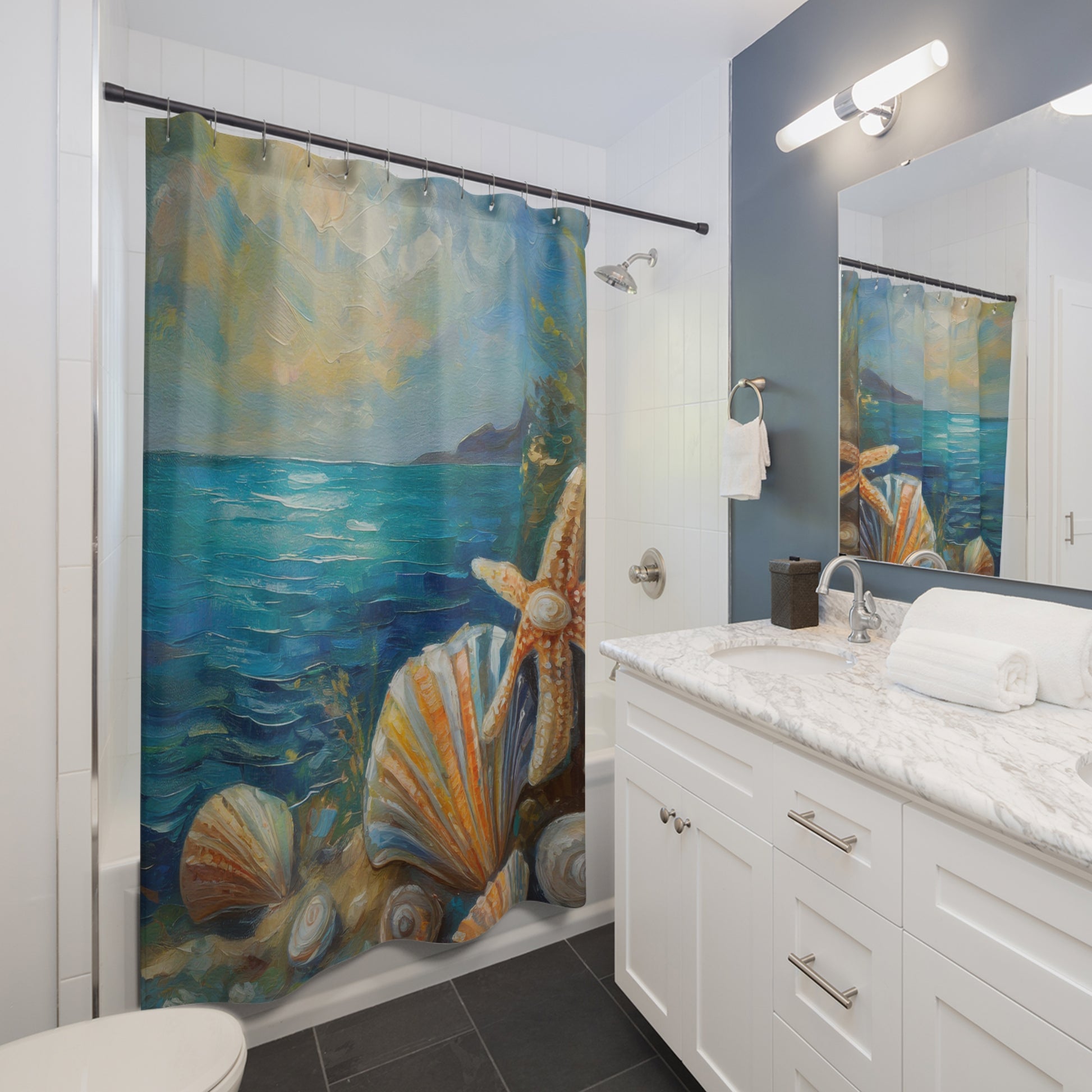 Bring a quiet seaside moment into your bathroom with this painterly shower curtain. Soft, sun-warmed hues of teal and sky blue roll into a tranquil horizon, while shells and a starfish gather in the foreground like a memory from a barefoot morning. The one-sided print captures brushstrokes and layered color, giving the scene depth and a handmade feeling that turns a routine into a small ritual. Hang it to add a coastal calm to your daily routine or to complete a beach-themed retreat where guests will pause and smile at the gentle, artful view.