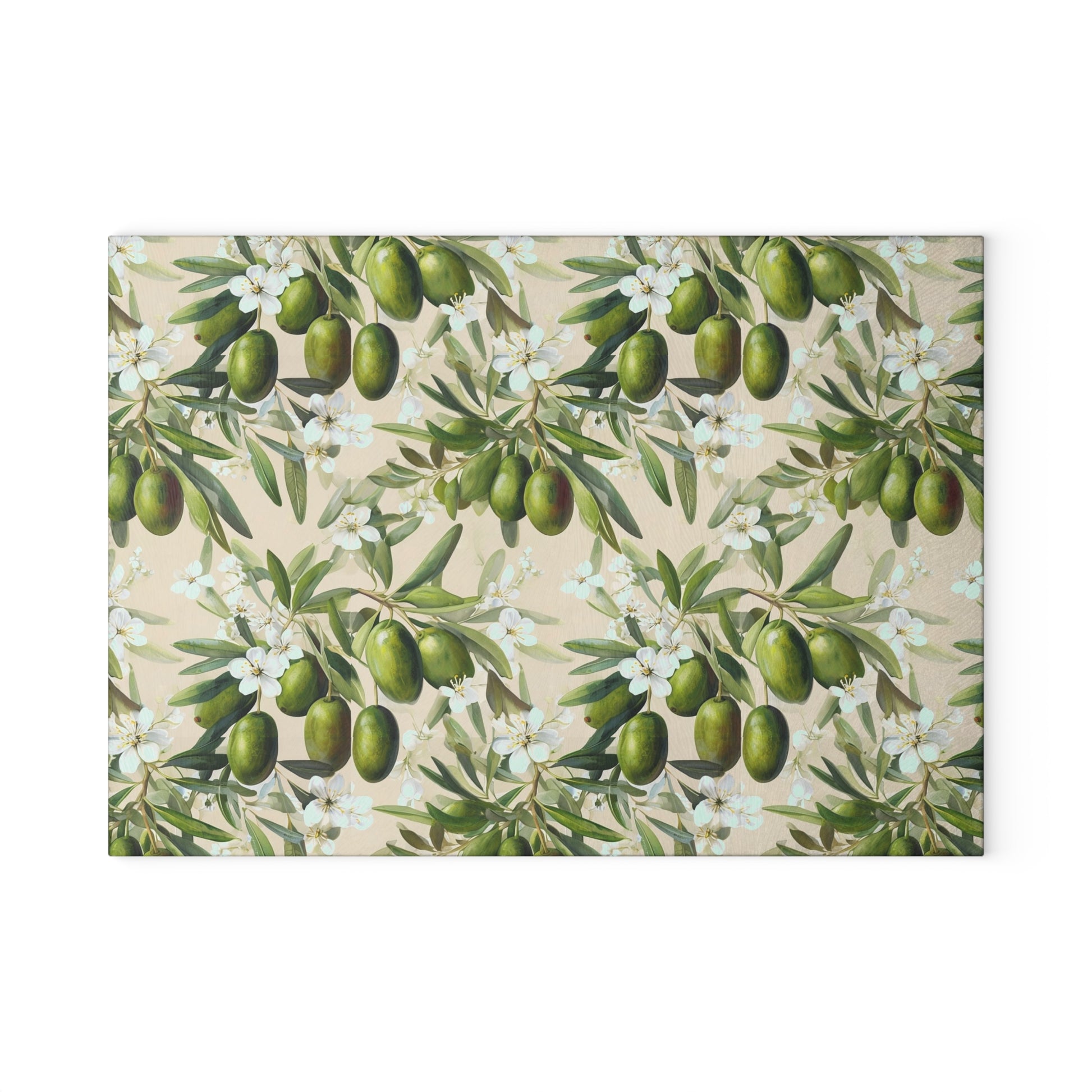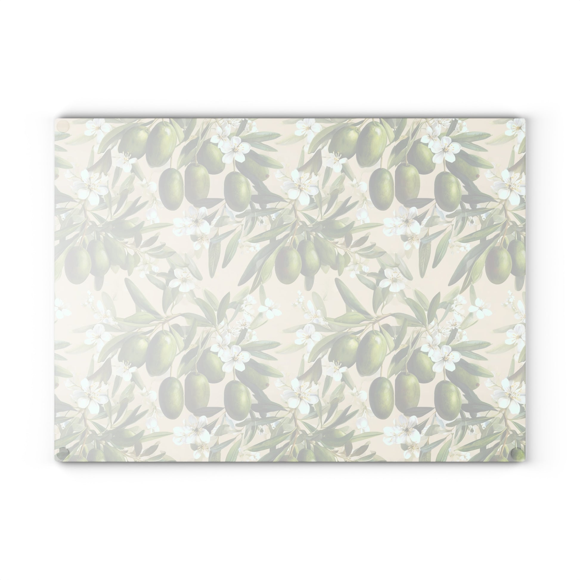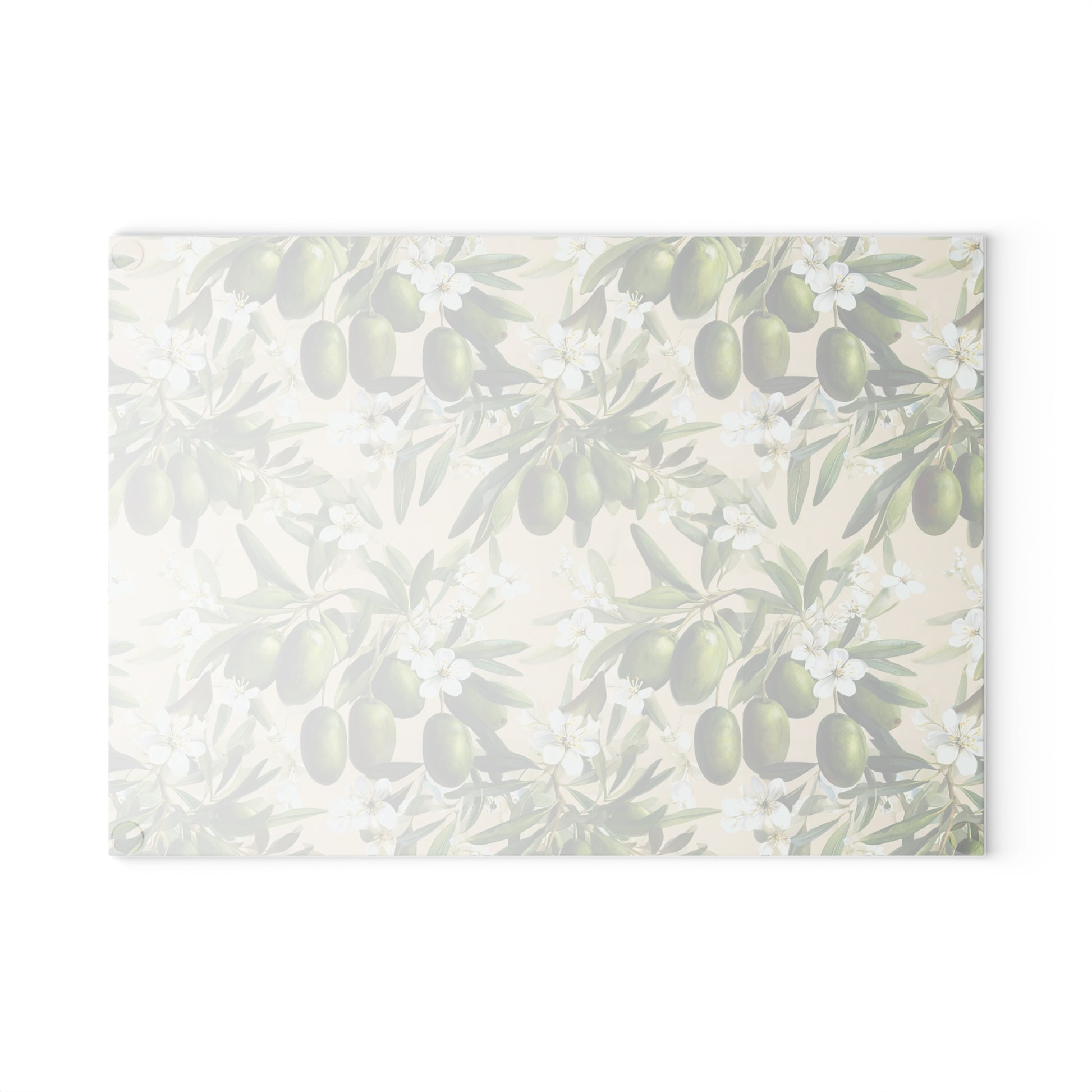Bright olives and soft blossoms stretch across a tempered glass surface, turning routine meal prep into a small, sensorial pause. This glass cutting board blends durable, scratch-resistant printing with a textured tempered-glass top that feels clean under the knife. Four tiny rubber feet hold it steady on the counter while vibrant, fade-resistant inks keep the olive motif lively through daily use. Lightweight and easy to move, it’s a calm, Mediterranean-inspired accent for weekday chopping or a leisurely weekend spread. Hand wash recommended to keep the print crisp and the glass gleaming.