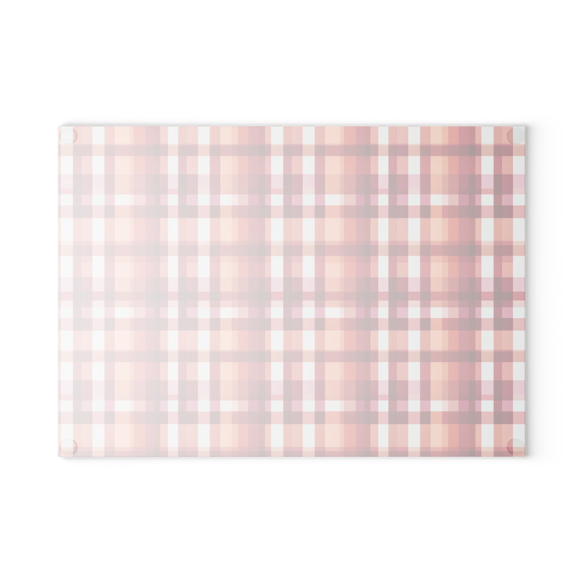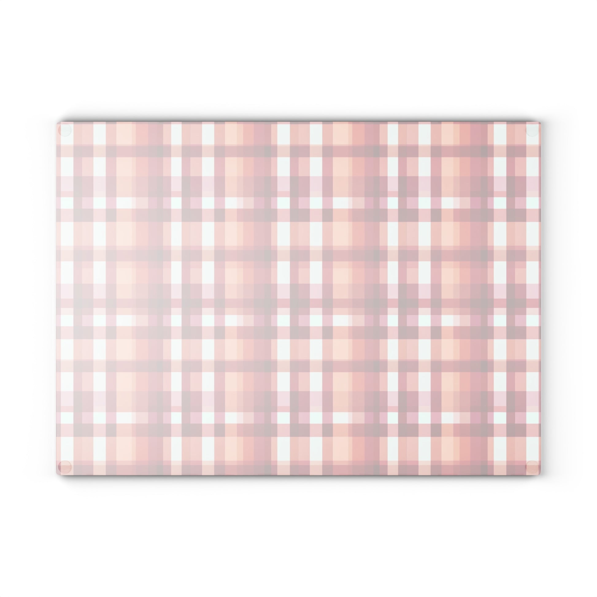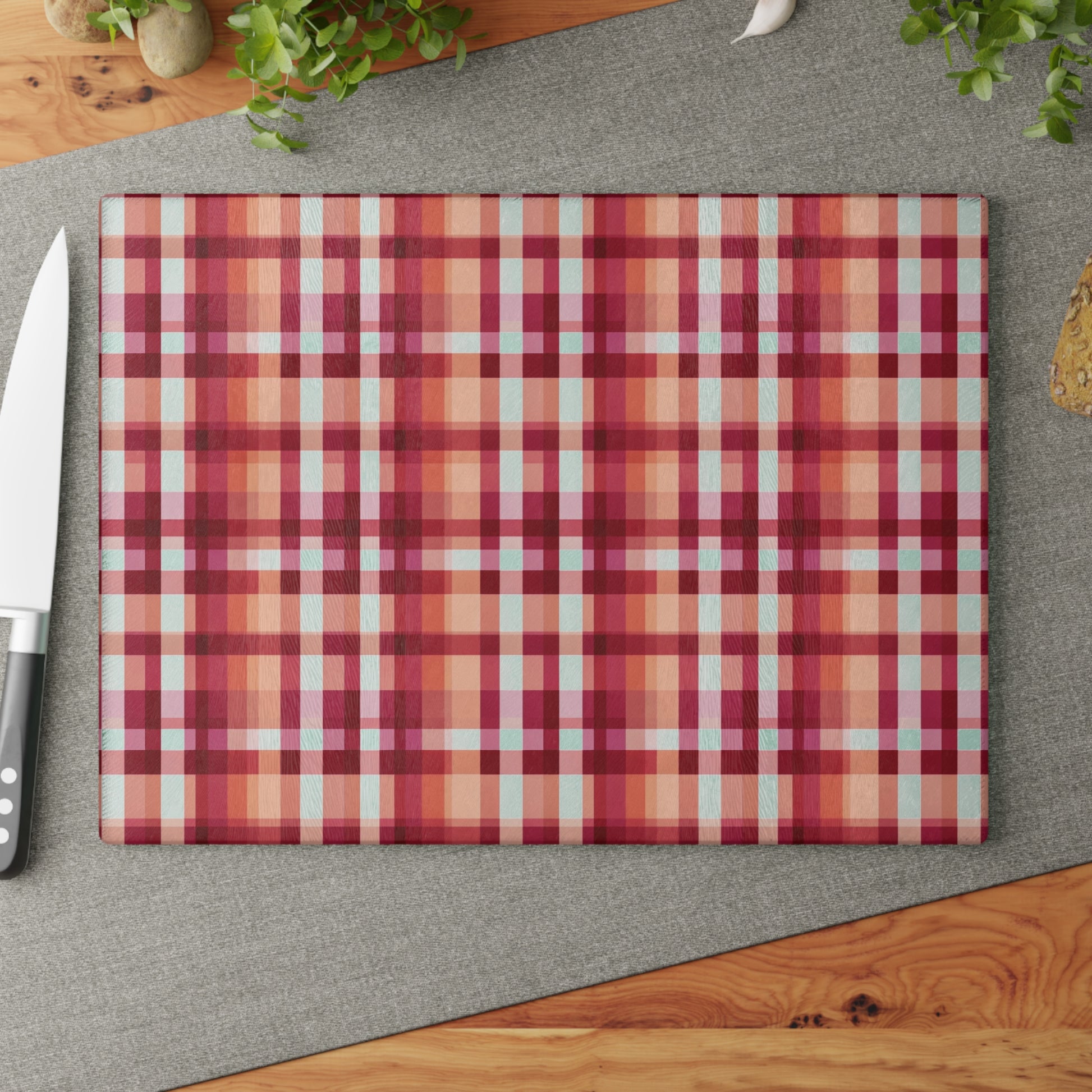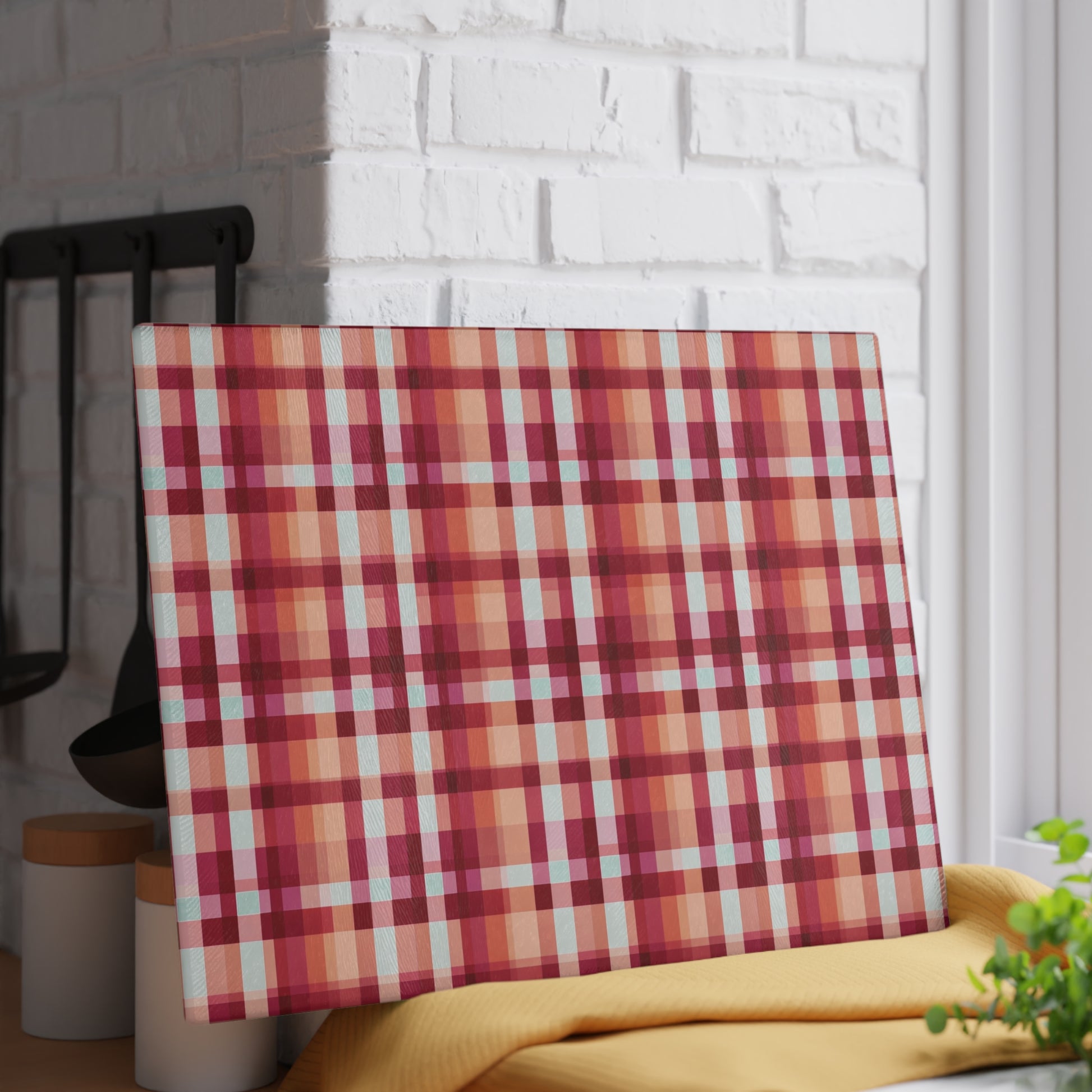 This tempered glass cutting board brings warm, woven plaid vibes to your kitchen. Rich reds, soft pinks and autumnal creams intersect in a textured plaid print that feels both nostalgic and modern. The surface is smooth and sanitary, with a durable print that resists scratching during everyday prep. Four rubber feet keep the board steady on counters while you chop, and its available small and medium sizes fit tidy meal prep or larger gatherings. Hand washing preserves the vibrant finish so the colors keep their crisp, cozy look.