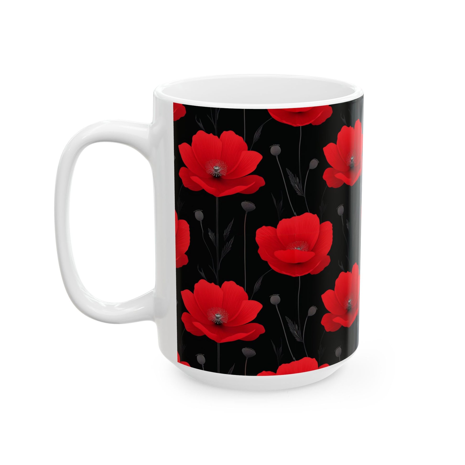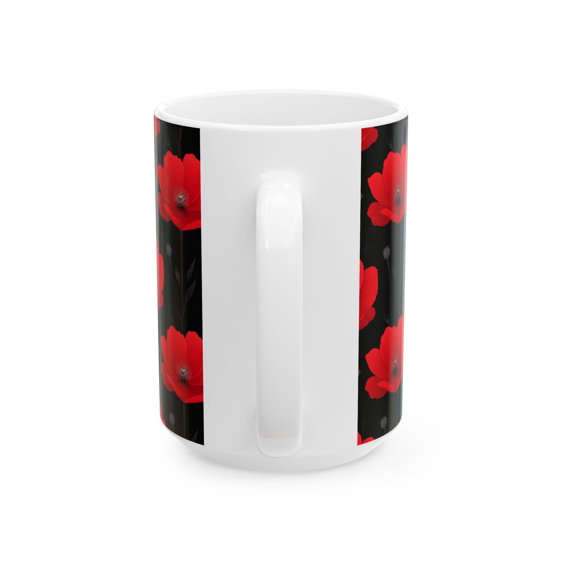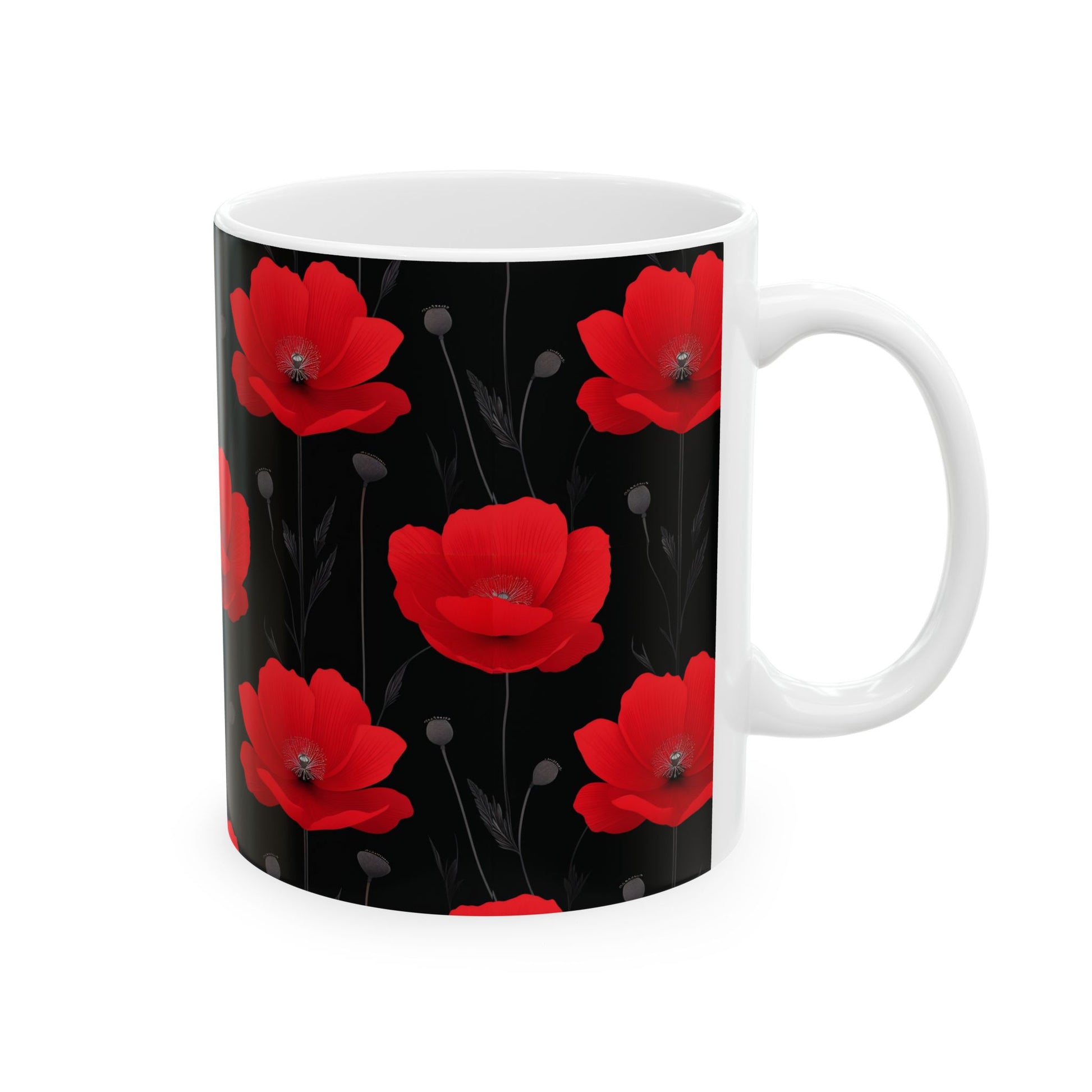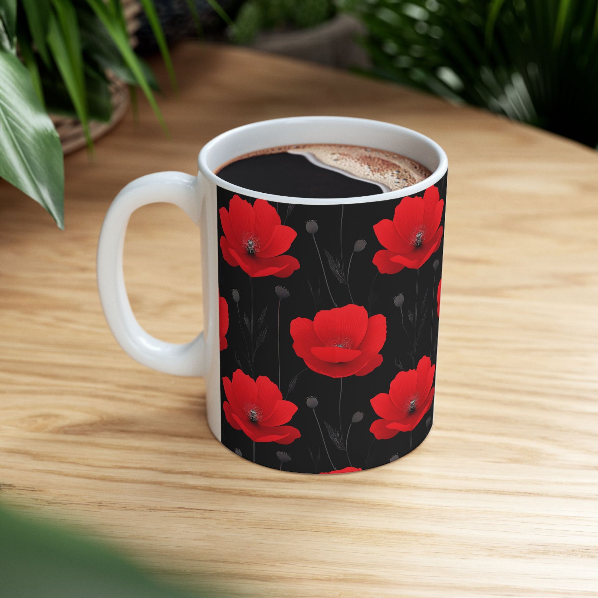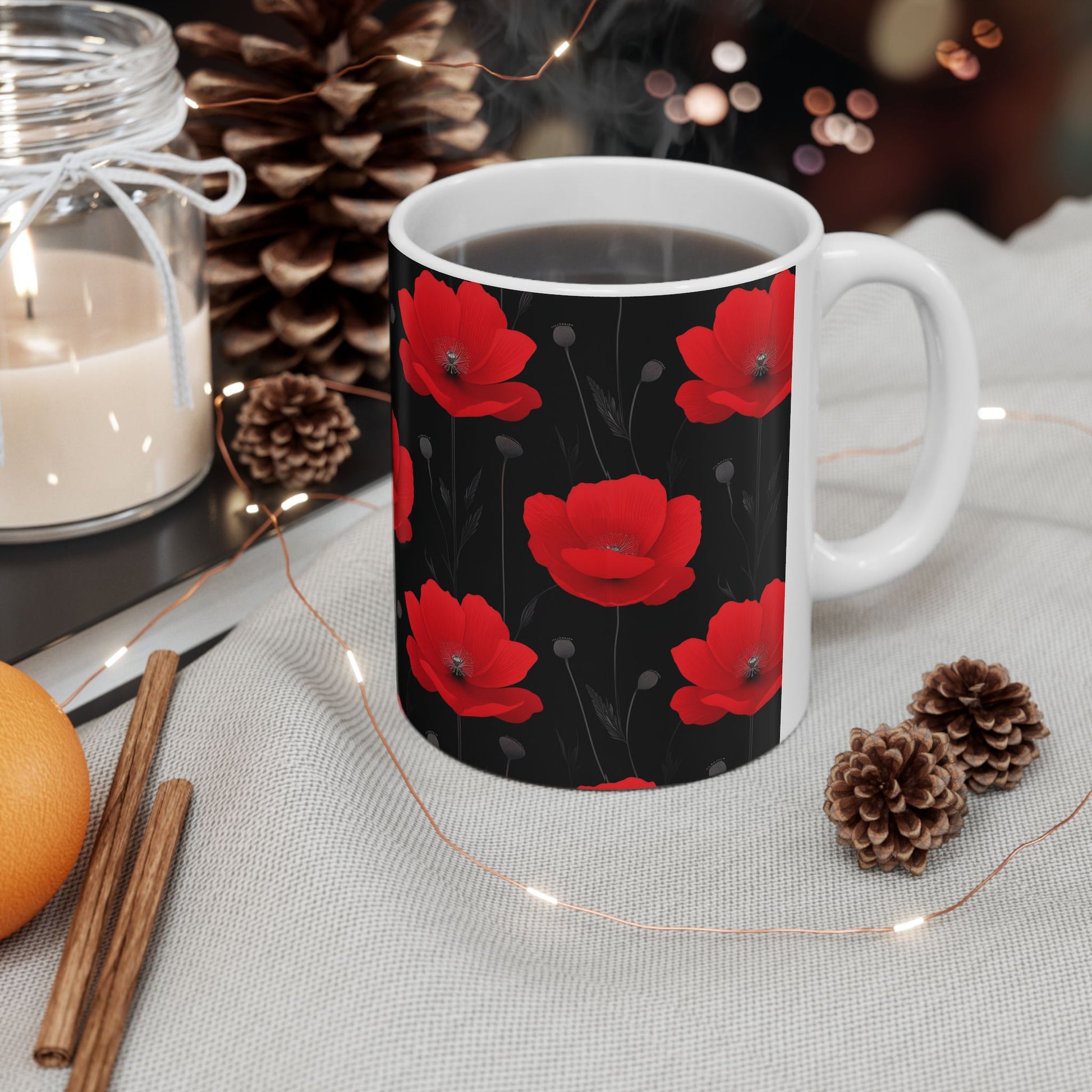 Hot, dark mornings softened by a scatter of crimson poppies. This ceramic mug brings bold red blooms against a deep black backdrop to your everyday ritual — the vibrant print feels handcrafted, the glossy surface catching the light as steam rises. It’s the kind of piece that turns a quick coffee into a quiet moment: a small, vivid pause on a hectic day. Let it sit on your desk or by the window; the floral mood lifts work hours, slow Sundays, and late-night sketching sessions alike.