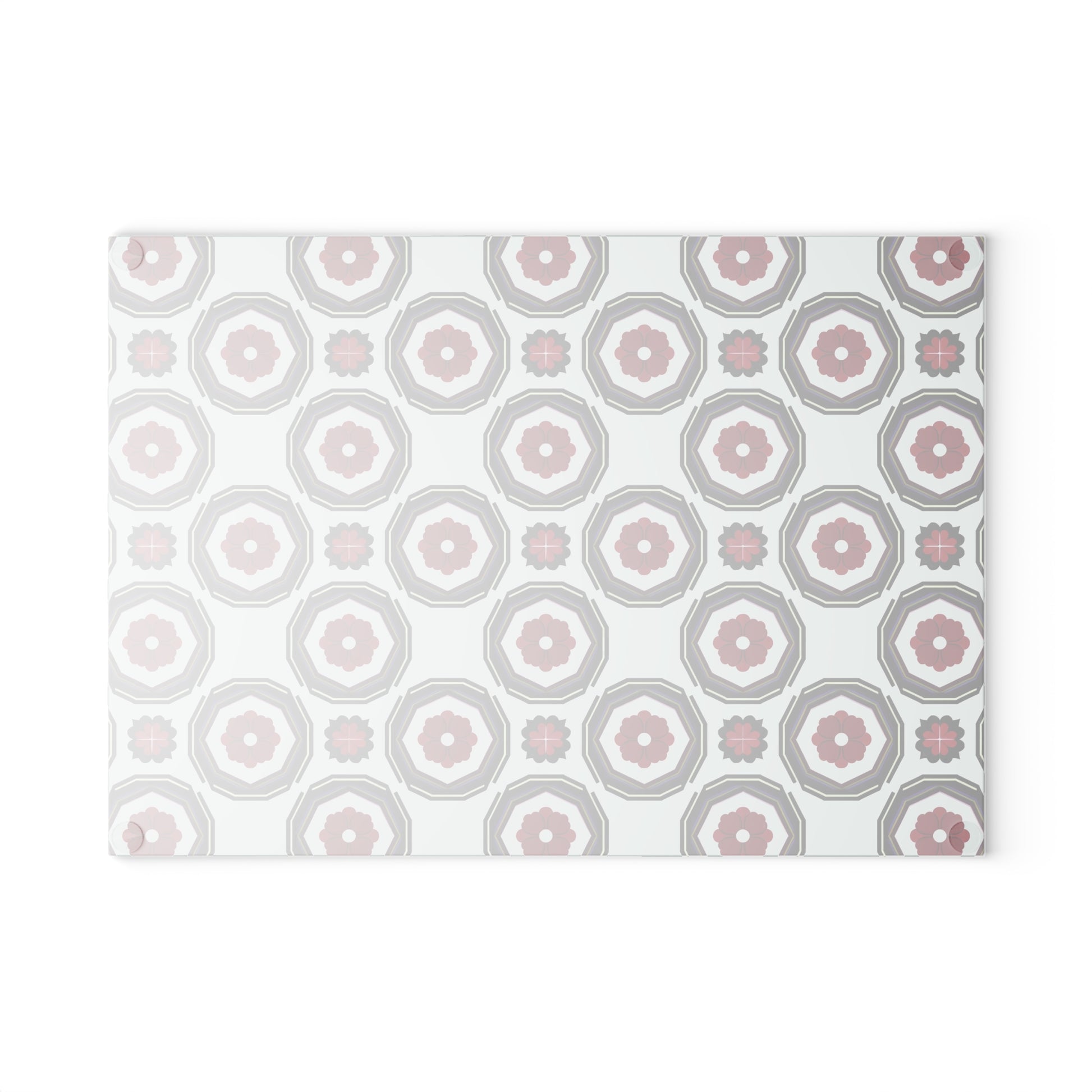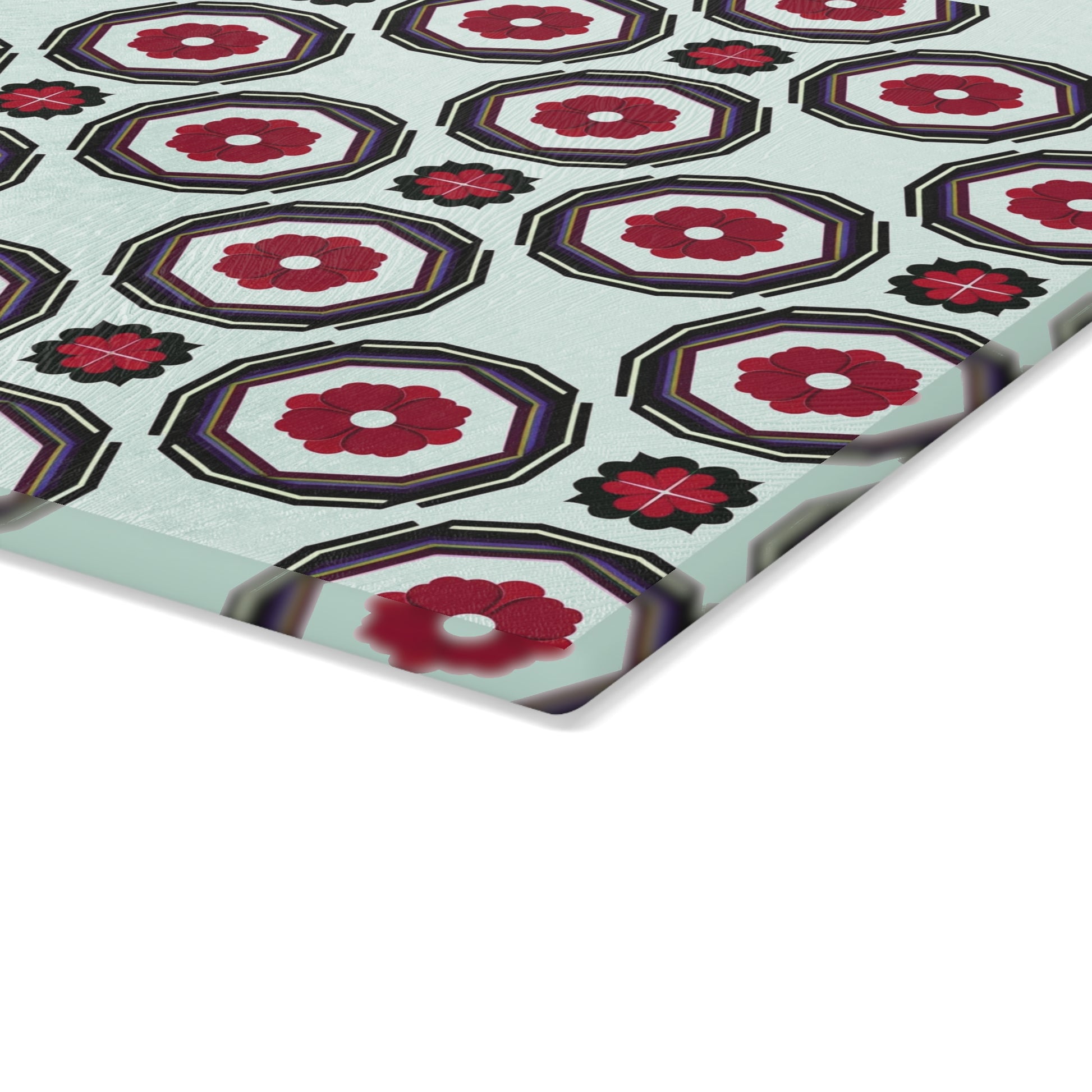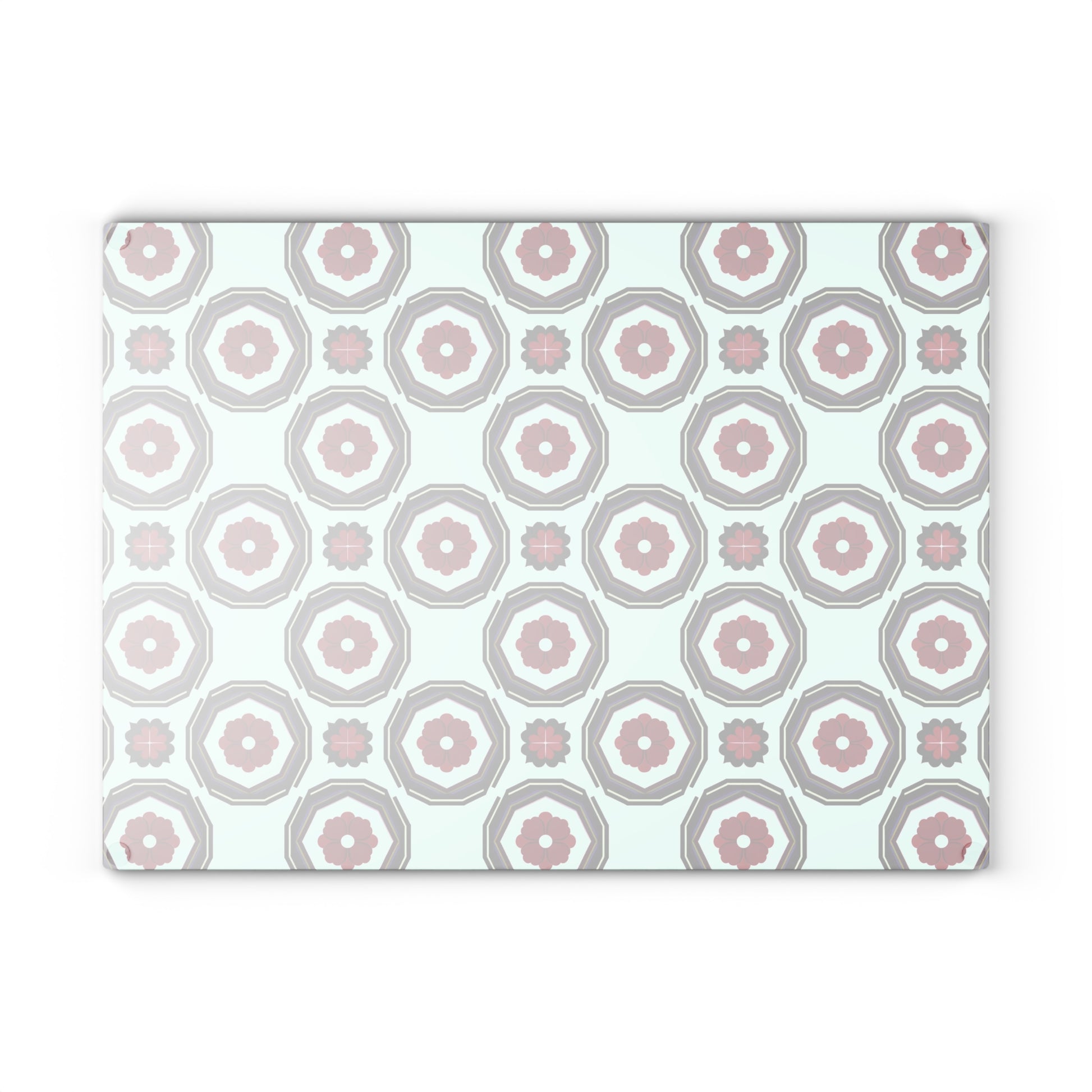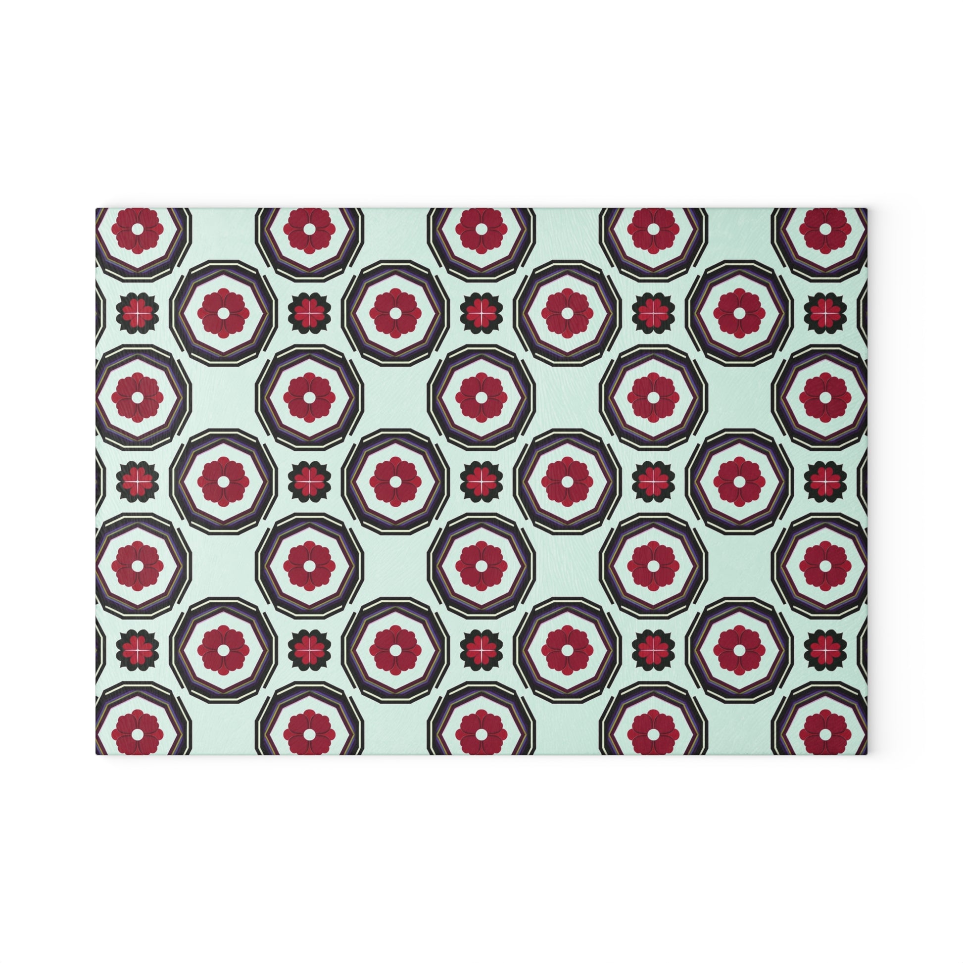 Bring quiet geometry and midday calm to your kitchen with this tempered glass cutting board. The repeating floral-medallion pattern — soft mint background with deep cranberry and charcoal accents — feels retro and modern at once. It sits steady on four small rubber feet, resists scratches from everyday chopping thanks to a durable decoration process, and wipes clean for a more sanitary prep surface than wood or plastic. Choose the smaller board for quick prep or the larger size for serving cheeses and hors d’oeuvres when friends drop by. The textured tempered glass gives a subtle grip for knives and adds a cool, polished look to your countertop.