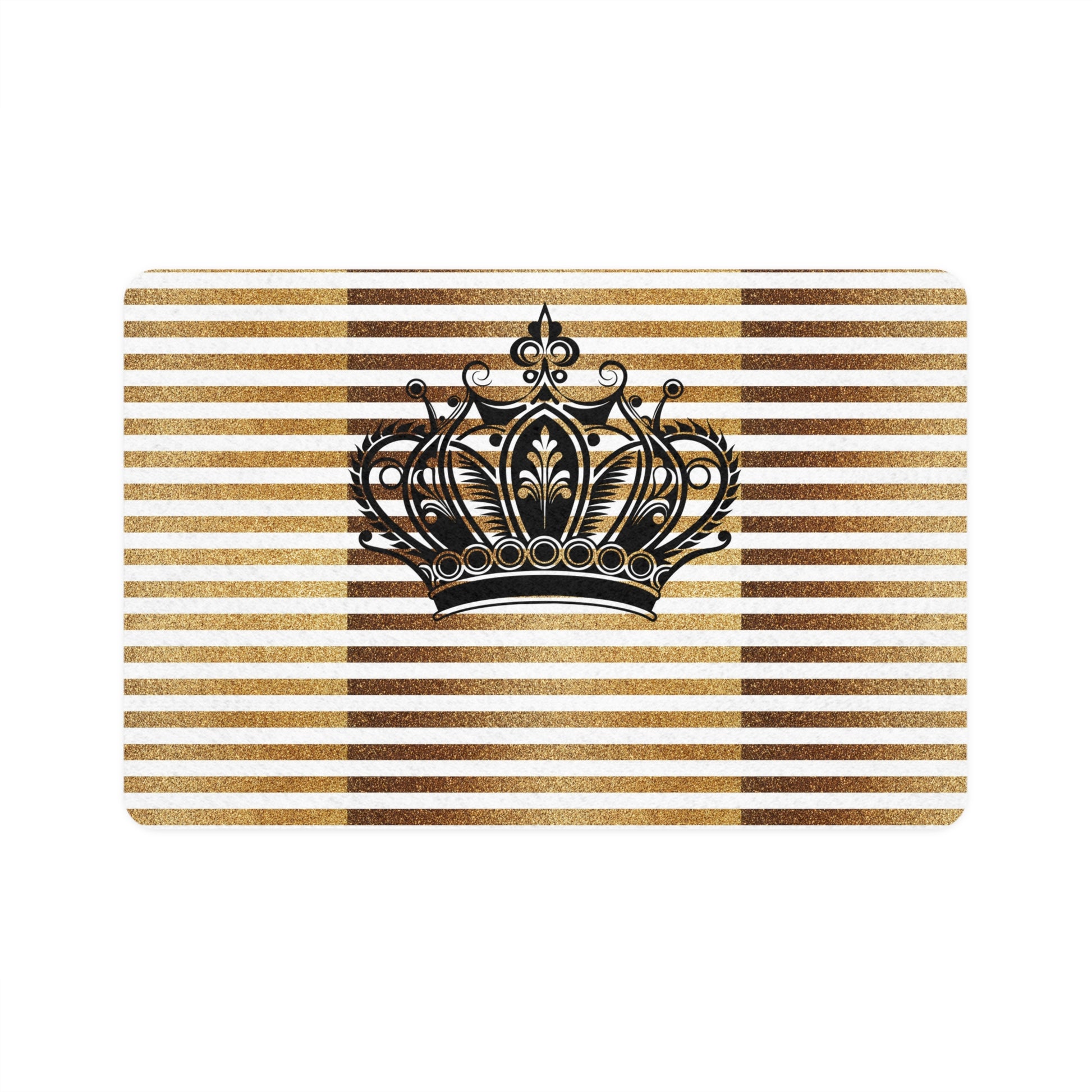 Bring a touch of regal charm to your pet’s dining corner with this stylish 12x18 food mat. Soft, quick-drying polyester on top carries a crisp, gold-and-brown striped pattern crowned by an elegant black tiara motif. The neoprene rubber underside grips floors so bowls stay put while your pup or cat eats. Lightweight and easy to wipe clean, it keeps spills contained and adds personality to everyday routines — a little moment of luxury for mealtime or snack breaks.