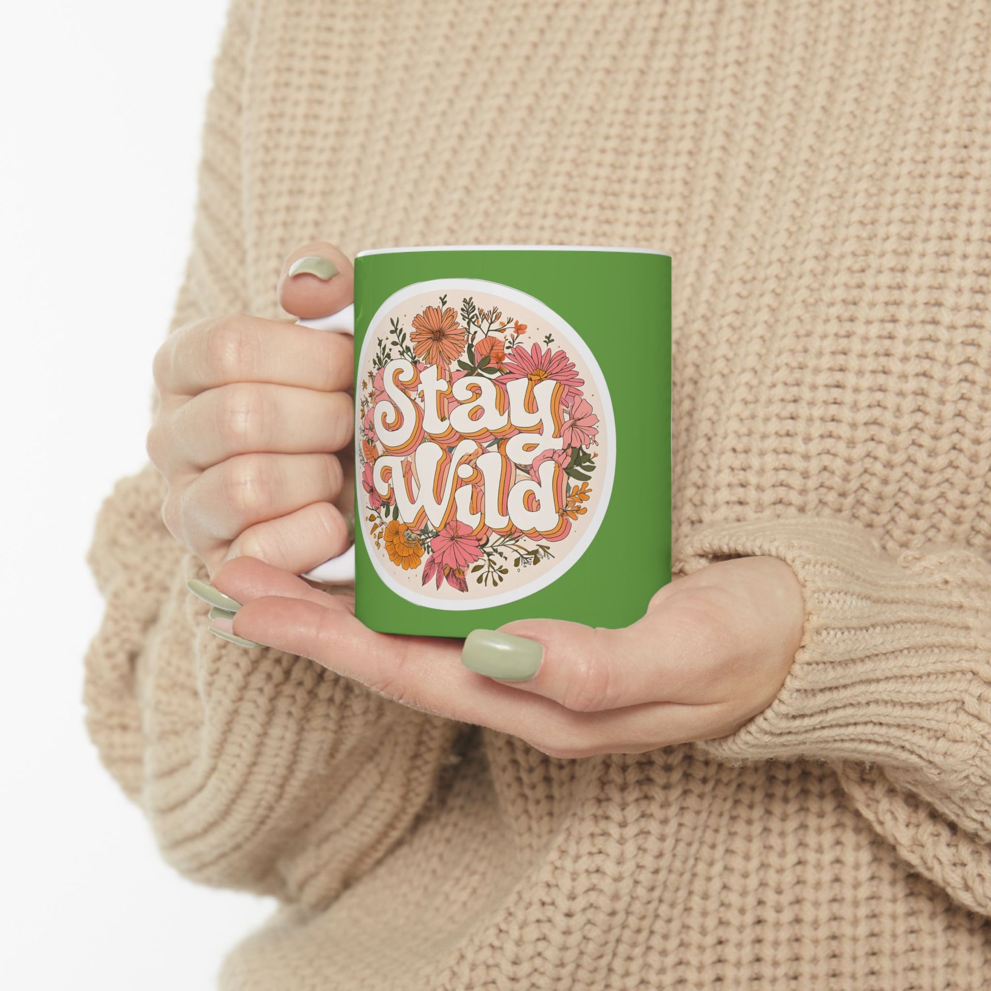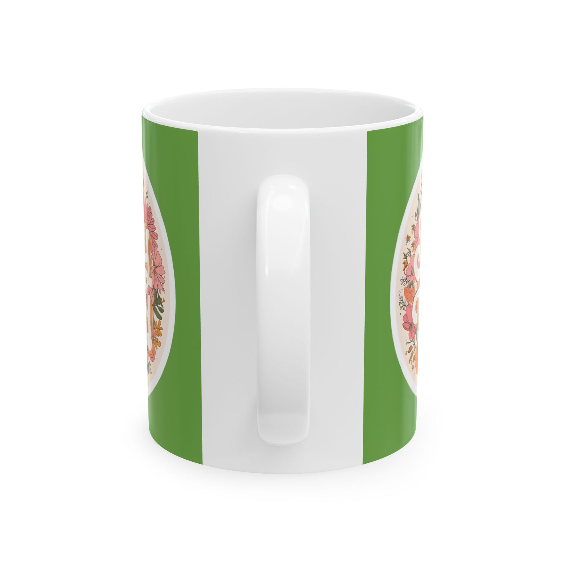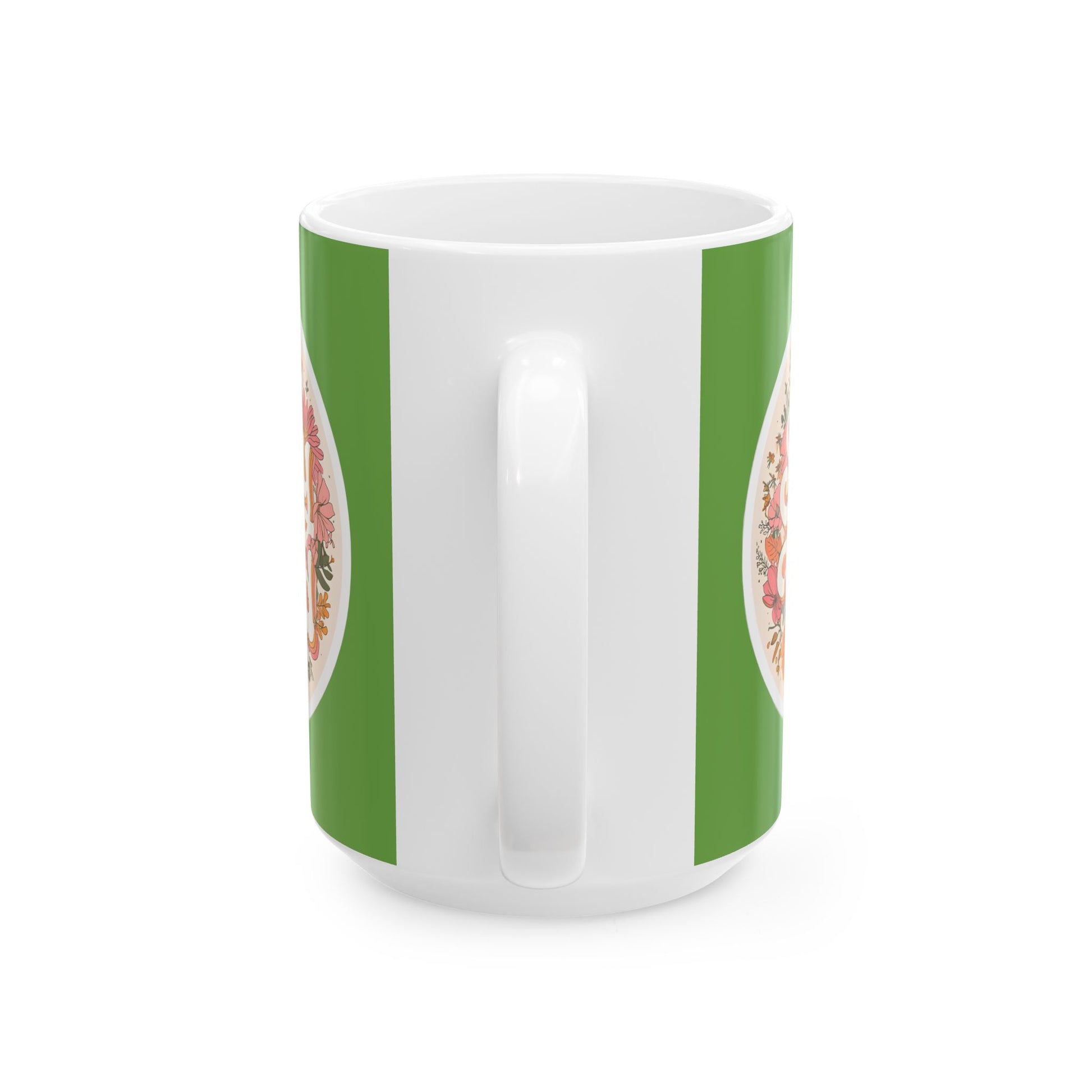 Warm and lively, this ceramic mug brings a burst of botanical cheer to everyday moments. The glossy white ceramic backdrop makes the hand-drawn floral emblem pop against a rich green wrap, giving each sip a little pause of joy. Lightweight enough for the morning routine, substantial enough to cradle on slow afternoons — the curved C-handle fits the hand comfortably while the shiny finish keeps colors crisp and inviting. Use it while tending a windowsill herb garden, journaling at sunrise, or sharing stories with a friend; the design feels like a small, sunny ritual that brightens ordinary days.