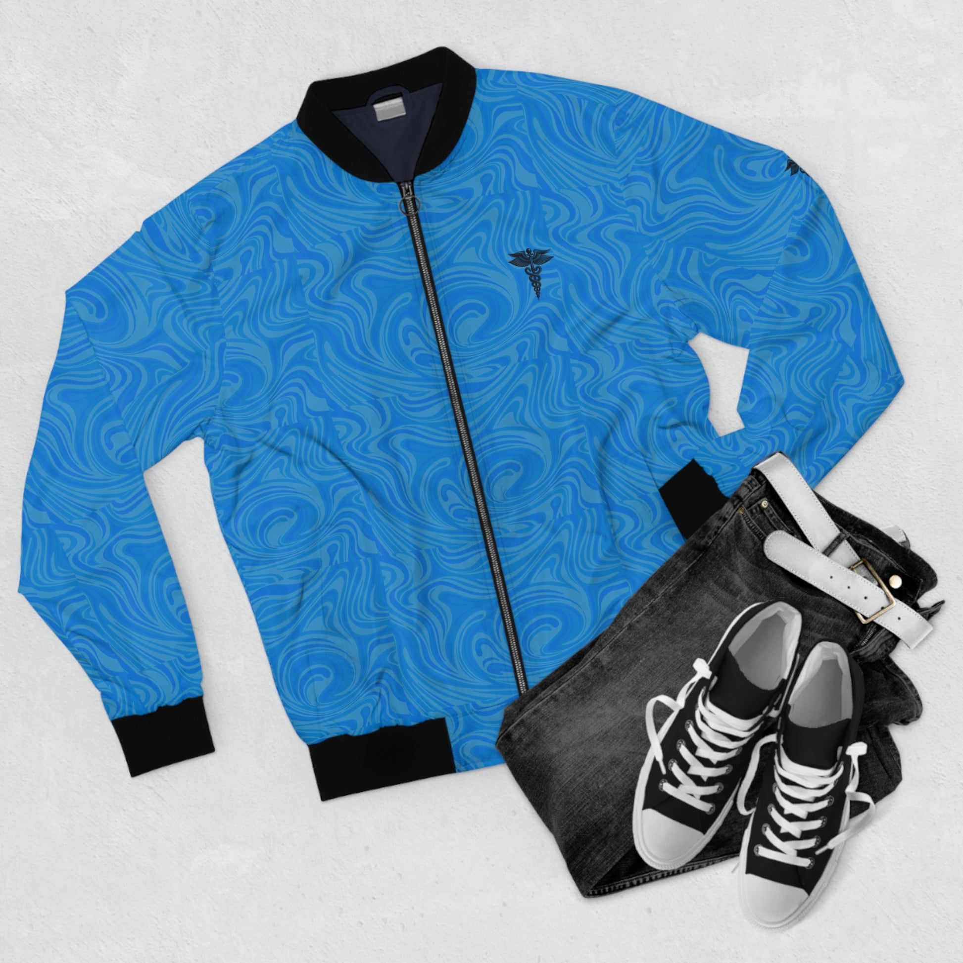 Elevate your style with this Men's Bomber Jacket, designed to make a statement while keeping you comfortable. Crafted from 100% polyester, it features an all-over print that captures attention and flair. The rib knit cuffs and collar offer a snug fit, while the front slanted pockets provide practicality for your daily outings. Ideal for layering, this jacket is perfect for chilly evenings out or casual gatherings with friends. Its vibrant blue tones and unique design make it a fantastic addition to your wardrobe, suitable for fashion-forward individuals and trendsetters alike. Celebrate the spirit of self-expression during holidays, music festivals, and casual get-togethers with this versatile piece, designed for those who value both style and comfort.