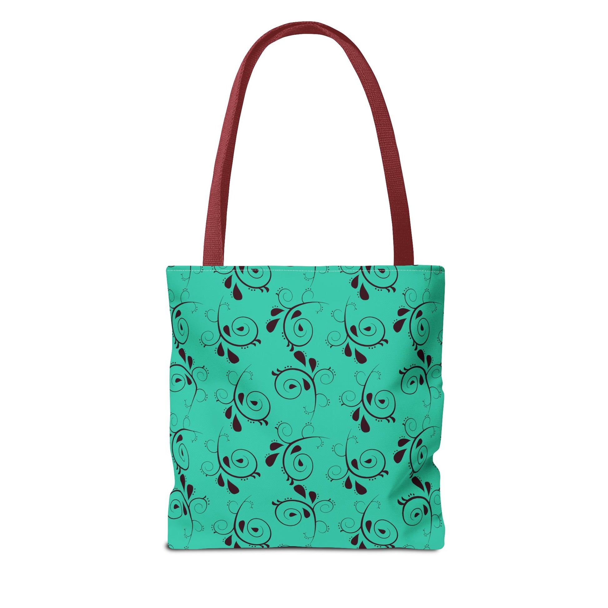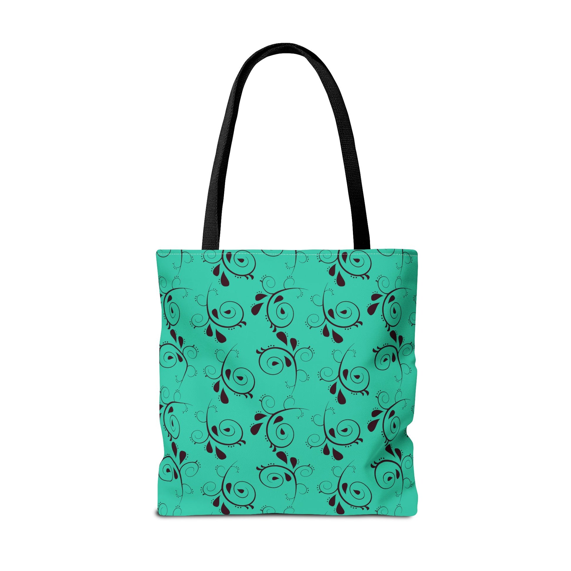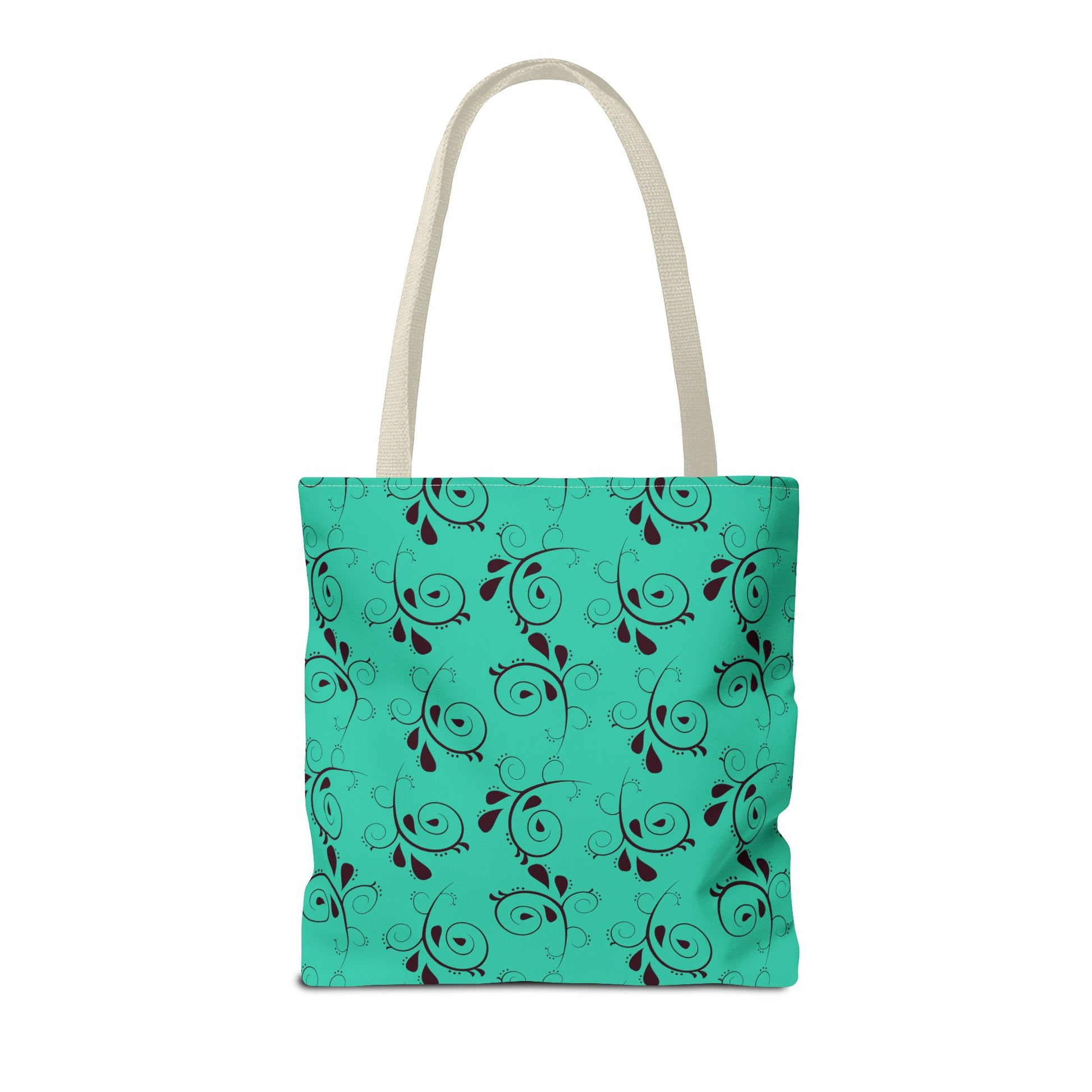 Light and lively, this turquoise tote brings a touch of playful elegance to everyday carry. A repeating swirl-and-leaf pattern dances across a bright sea-green background, giving the bag a handcrafted, artsy feel without being fussy. The structured boxed corners and reinforced handle stitching mean it keeps its shape while holding groceries, market finds, sketchbooks, or a laptop sleeve. The black contrast handles and neat interior laminate give a clean, confident finish that works on errands, at art markets, or as a cheerful companion to weekend outings.