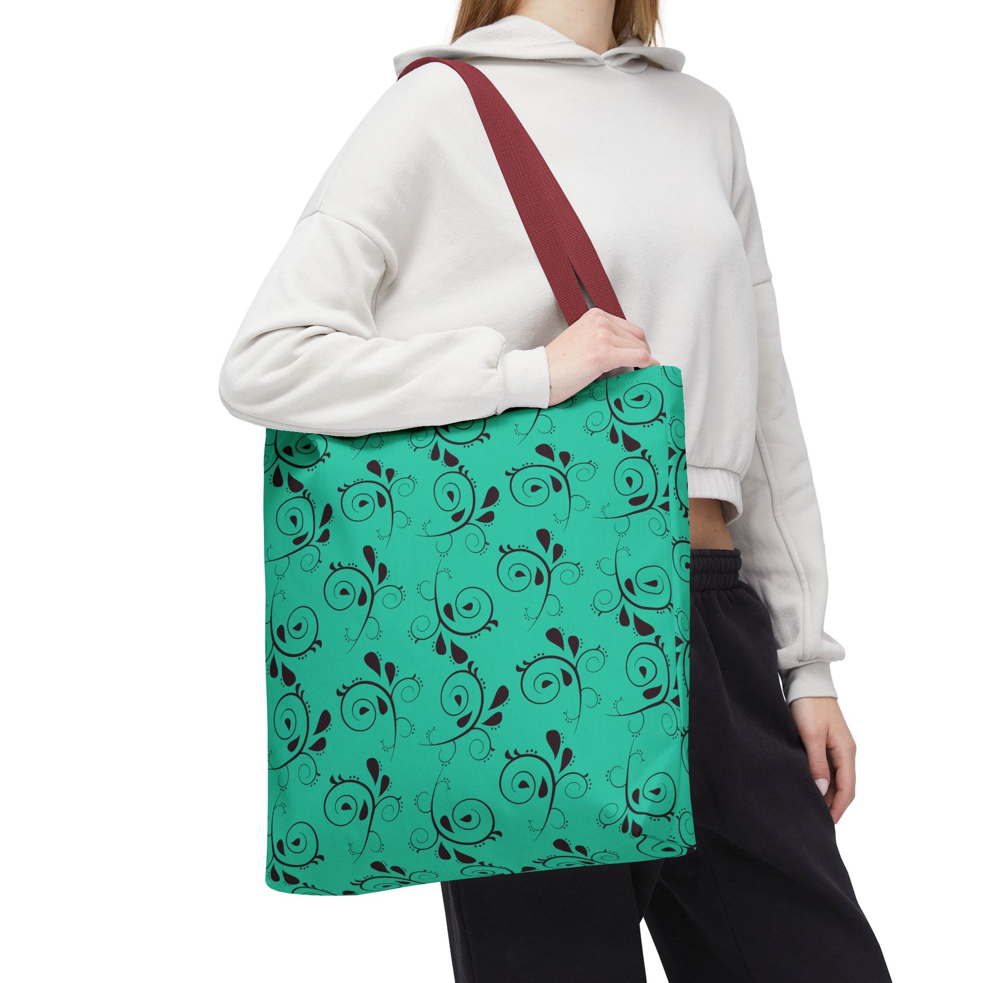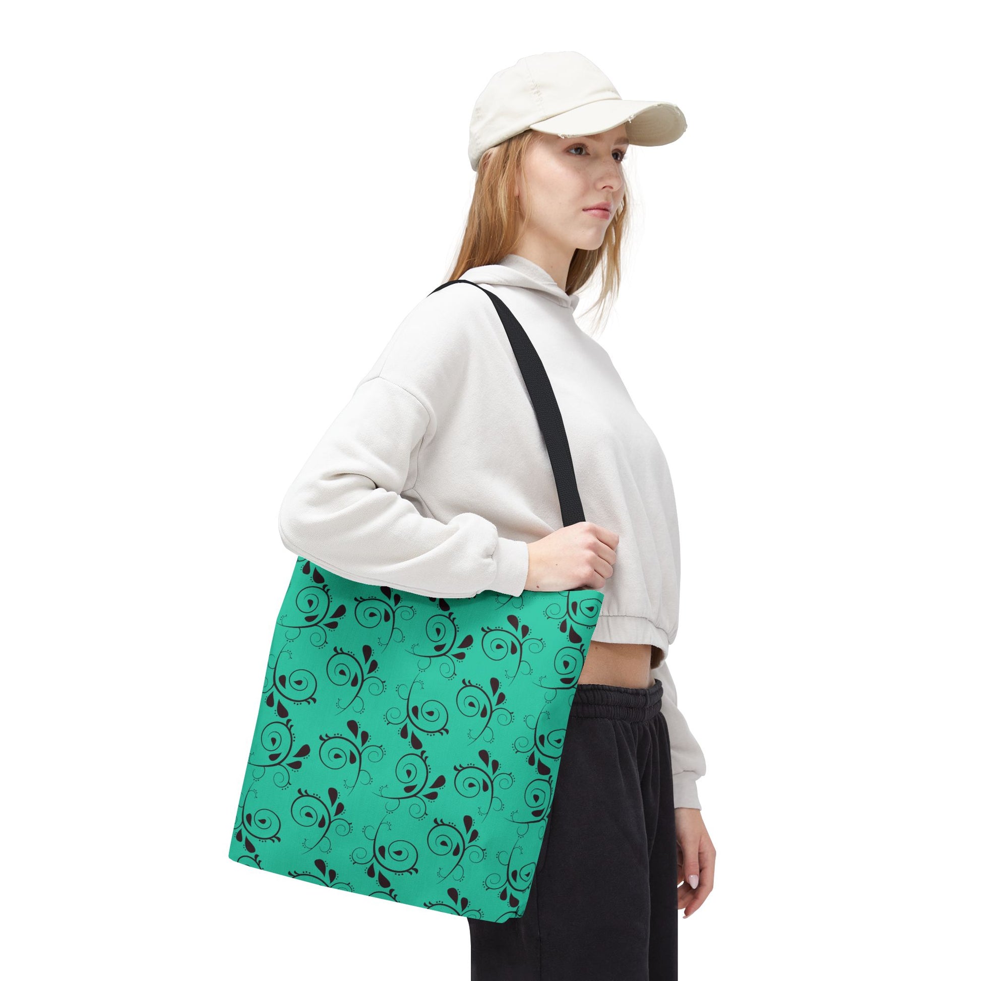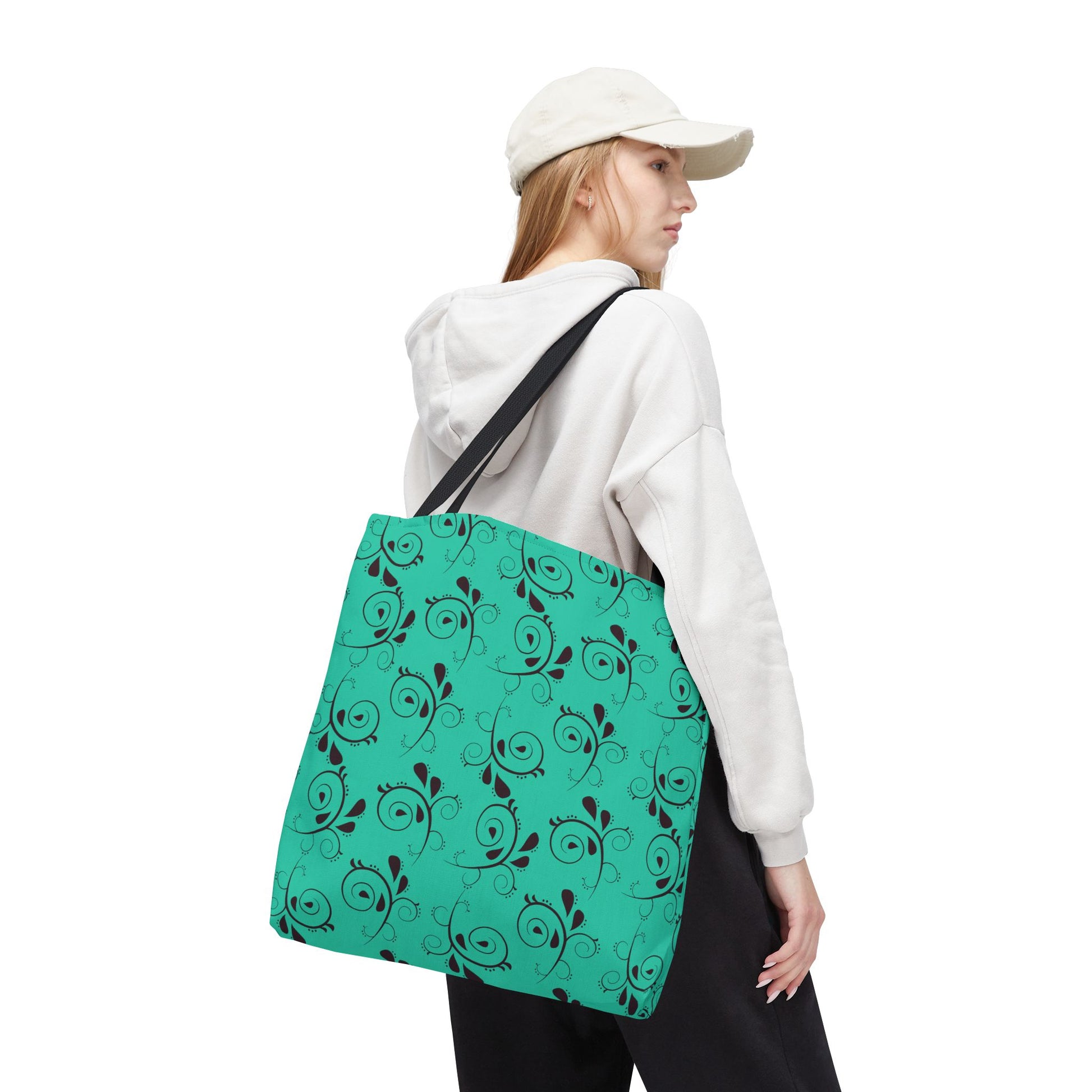 Light and lively, this turquoise tote brings a touch of playful elegance to everyday carry. A repeating swirl-and-leaf pattern dances across a bright sea-green background, giving the bag a handcrafted, artsy feel without being fussy. The structured boxed corners and reinforced handle stitching mean it keeps its shape while holding groceries, market finds, sketchbooks, or a laptop sleeve. The black contrast handles and neat interior laminate give a clean, confident finish that works on errands, at art markets, or as a cheerful companion to weekend outings.