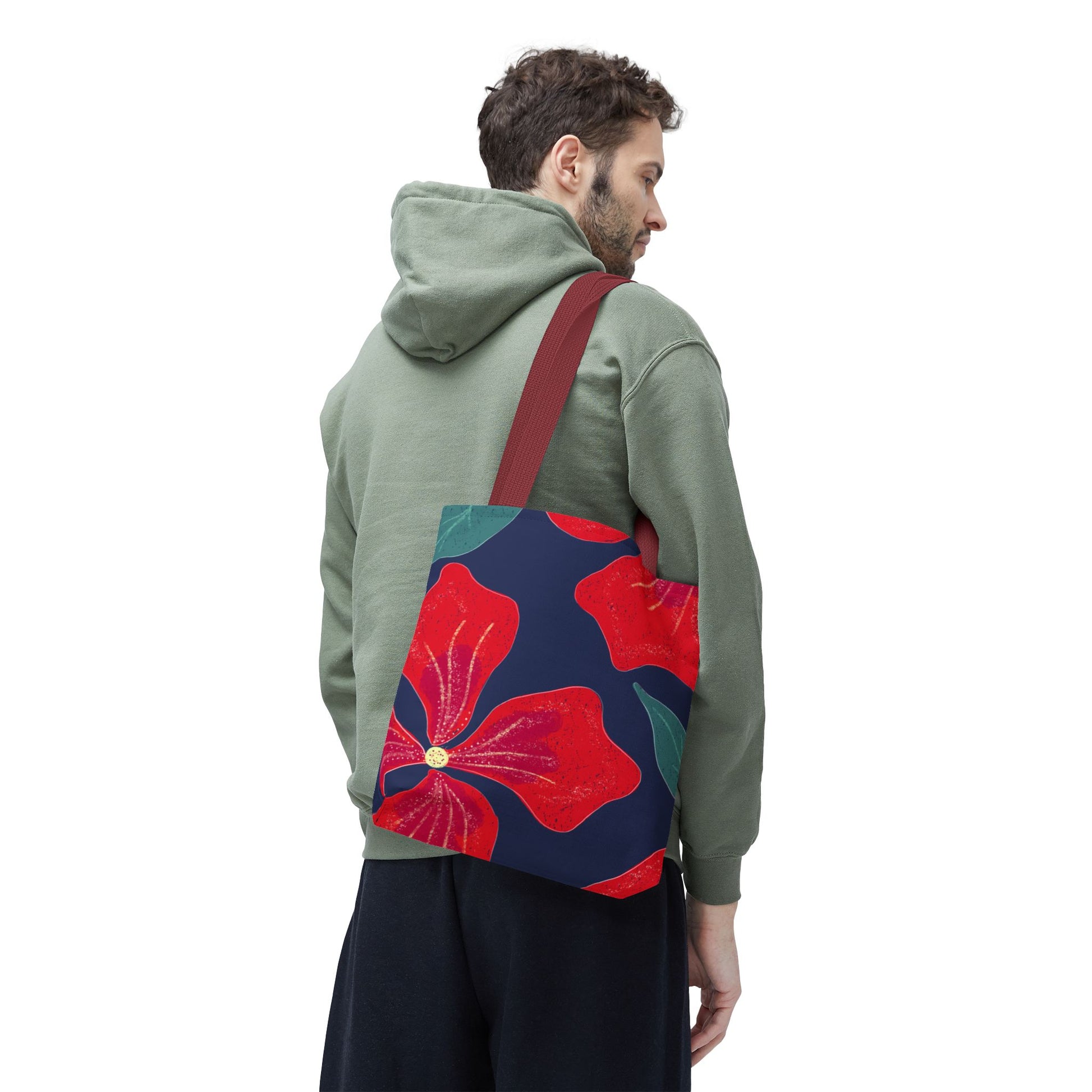 Introducing a vibrant tote bag that brings a touch of elegance to your everyday style. Crafted from durable 100% polyester, this bag is perfect for carrying your essentials while making a statement. Its eye-catching design features bold red floral patterns against a deep blue background, creating a cheerful and festive vibe that's ideal for any occasion.