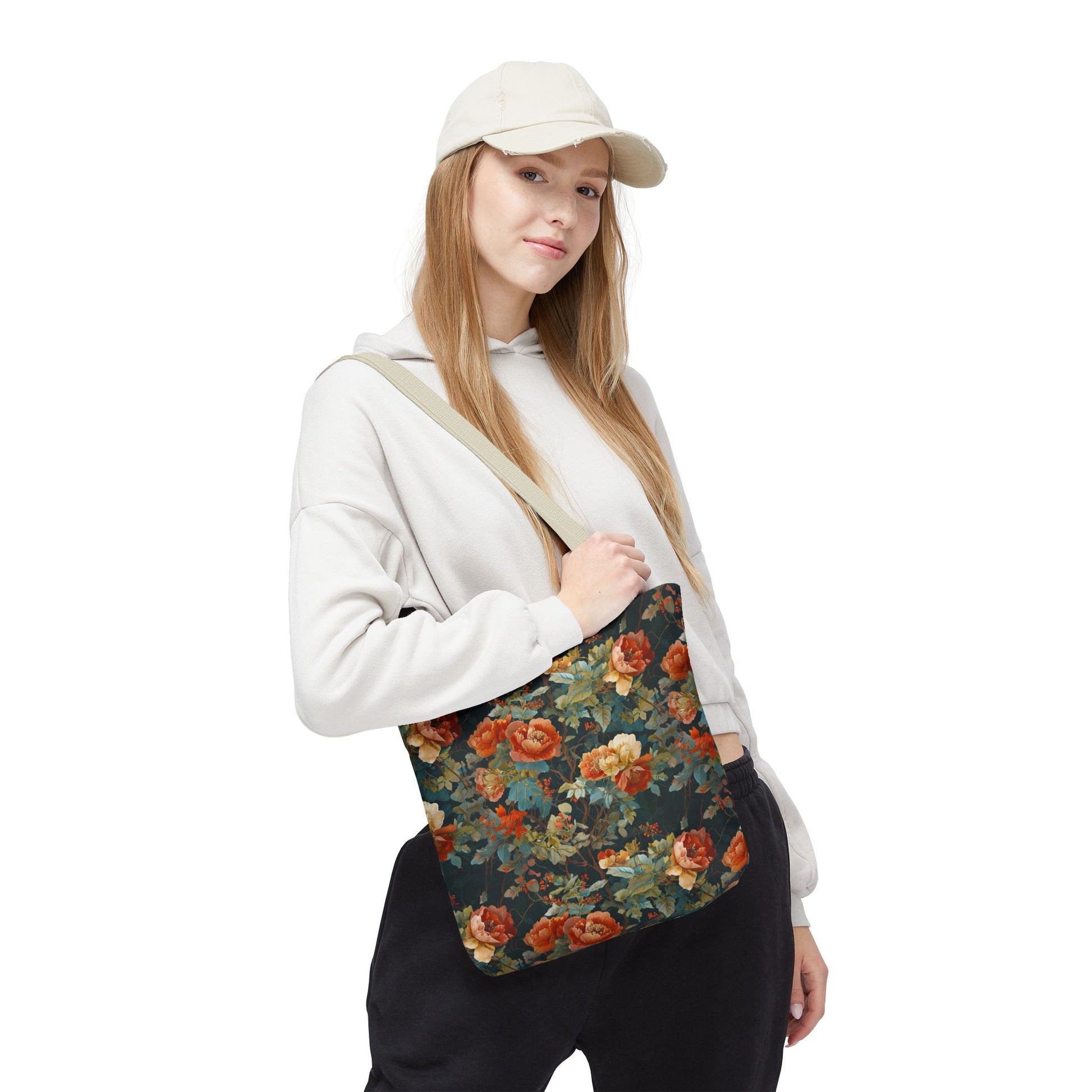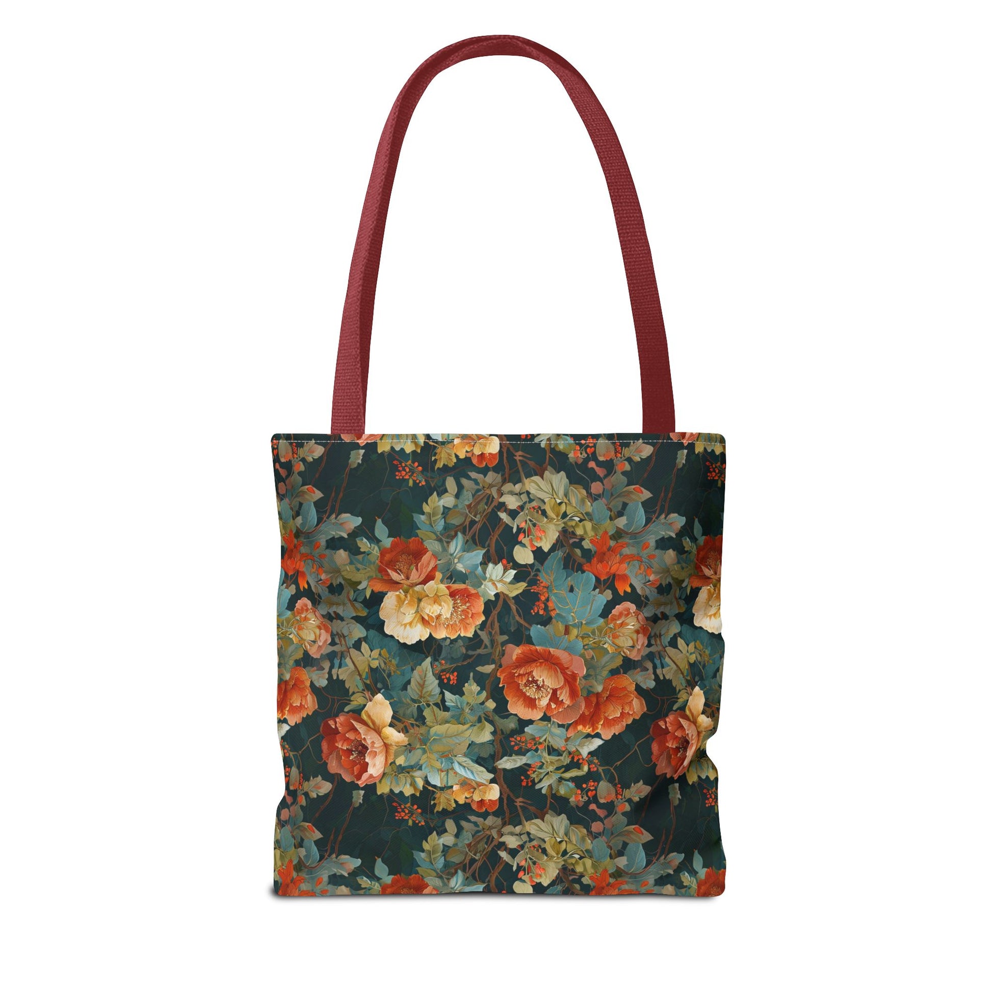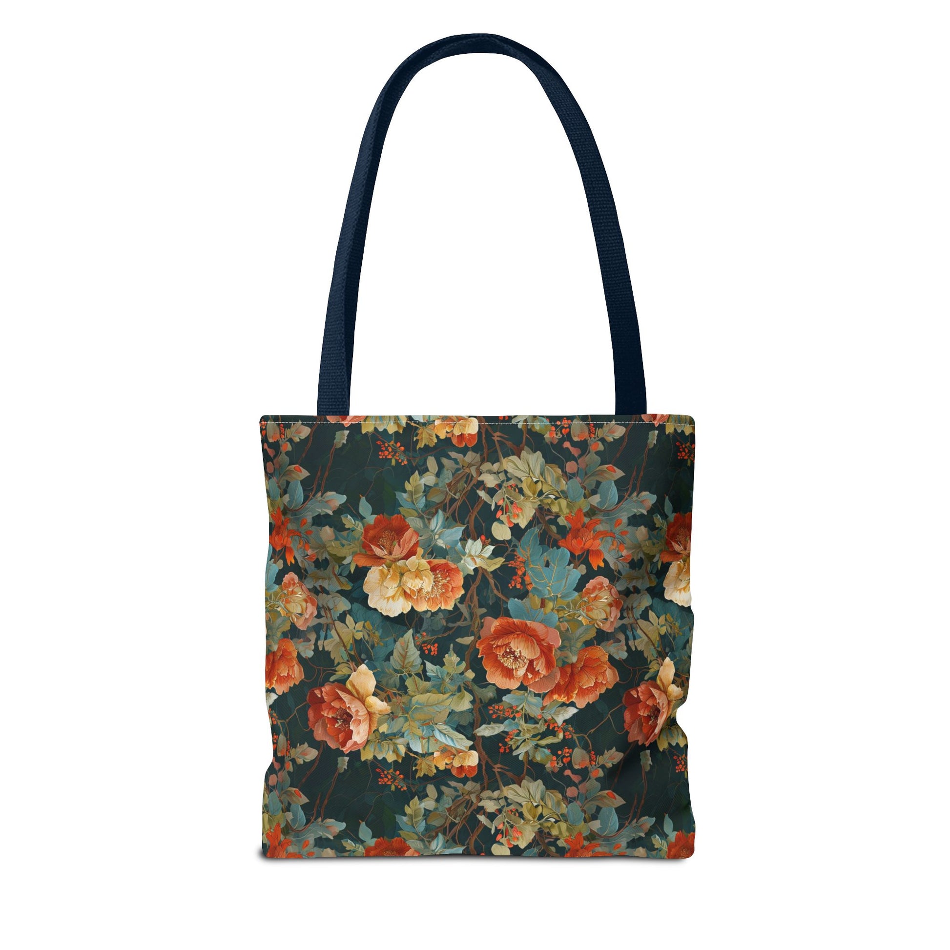 This roomy tote brings a vintage floral mood to everyday runs — a deep, painterly pattern of roses and foliage printed edge-to-edge on a sturdy polyester body. The dark, moody background makes the warm coral and creamy blooms pop, while boxed corners add real carrying space for a market haul, library stack, or work essentials. Cotton handles with reinforced stitching sit comfortably on the shoulder, and the inner non-woven laminate helps the bag hold its shape and stand up to daily use. Choose a handle color to match your style and pick the size that fits your routine.