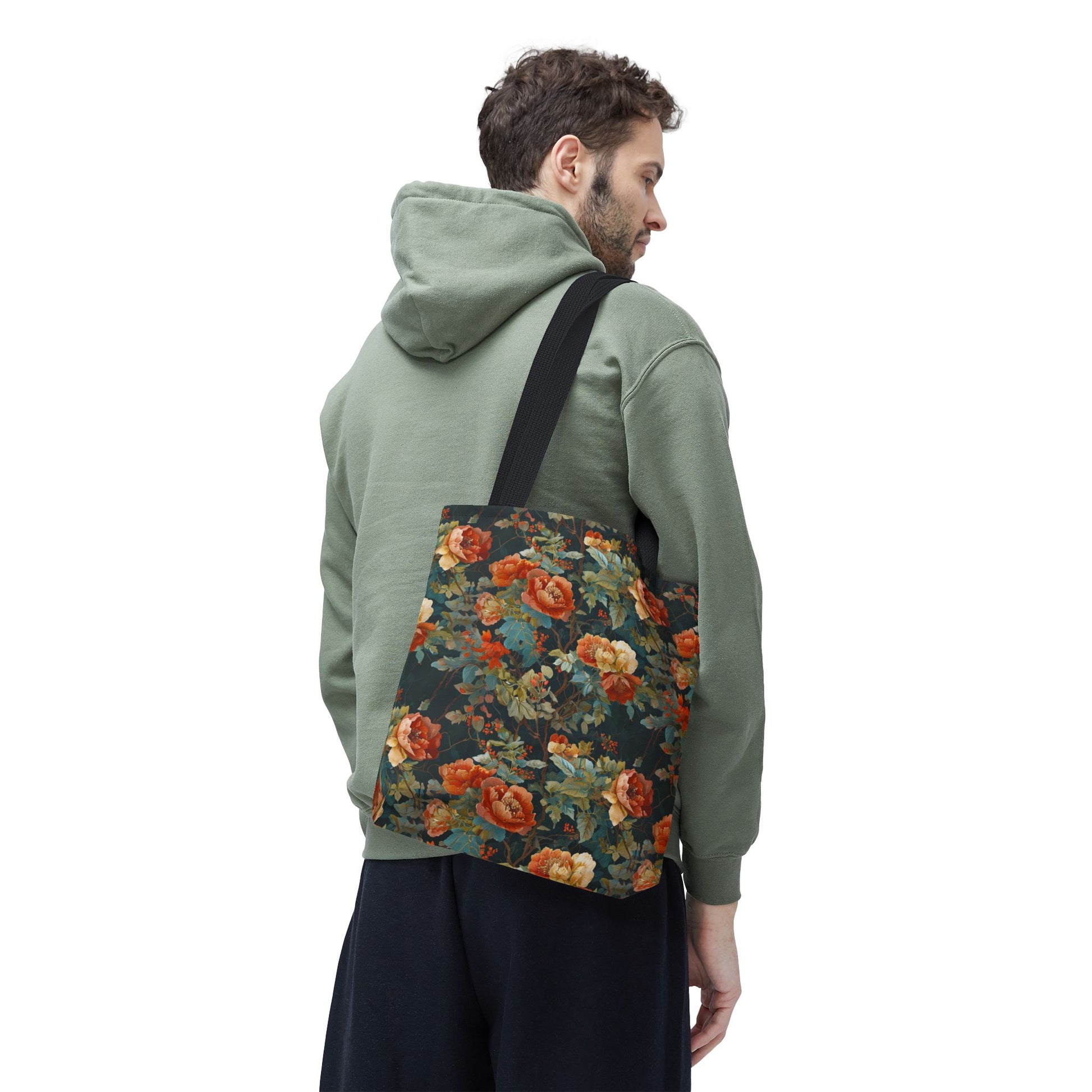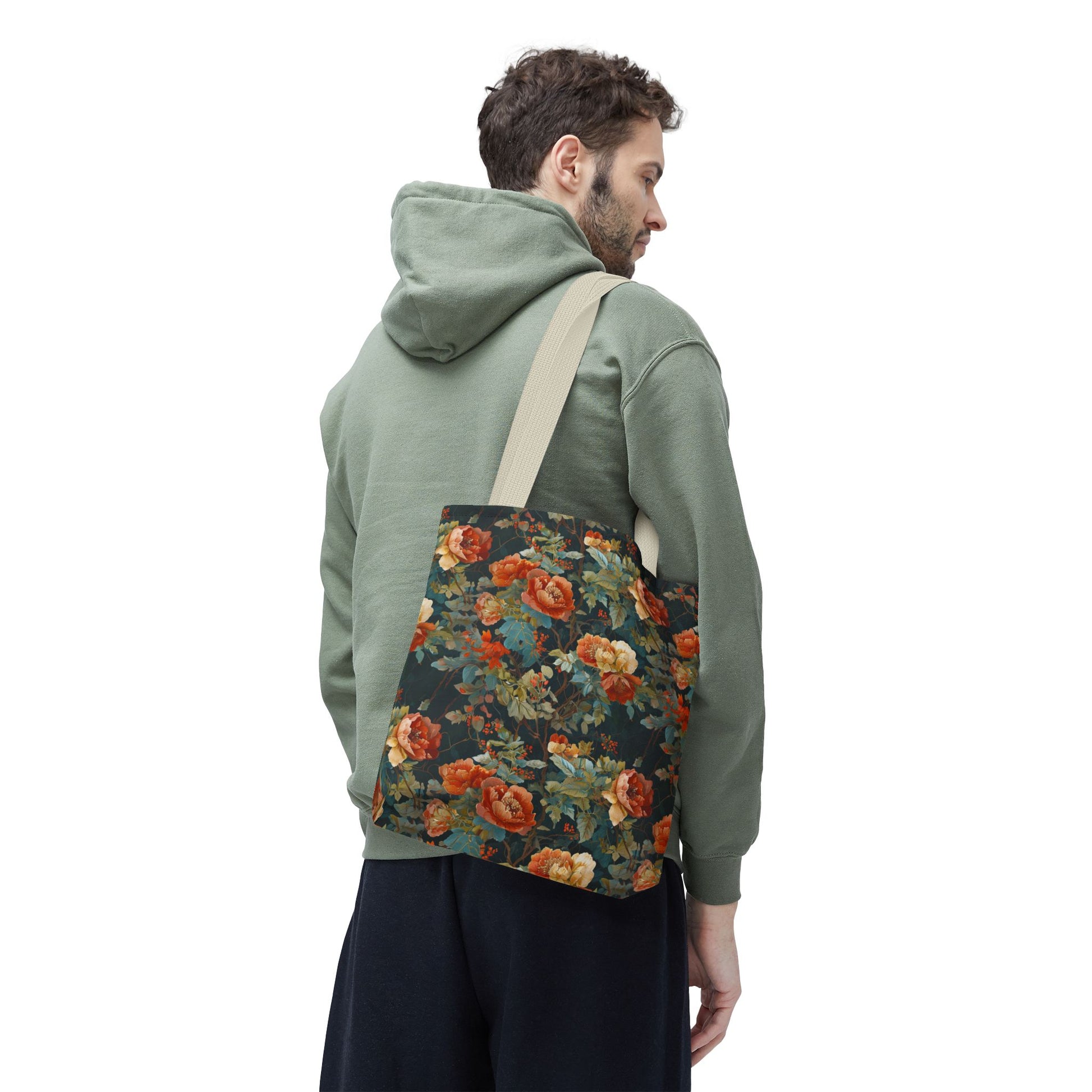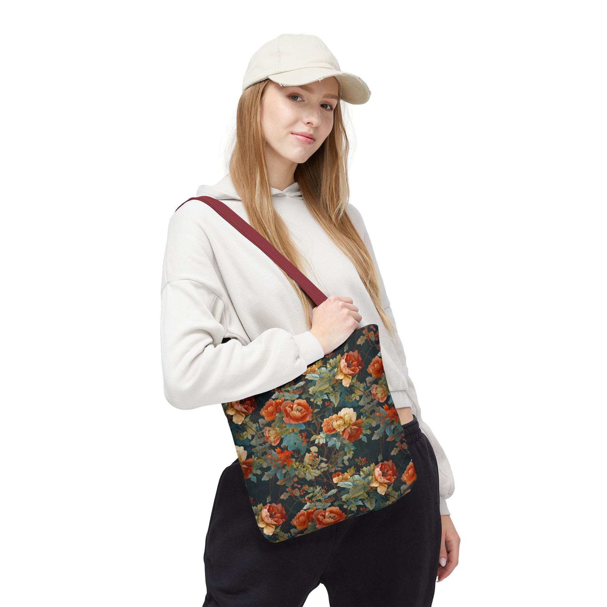 This roomy tote brings a vintage floral mood to everyday runs — a deep, painterly pattern of roses and foliage printed edge-to-edge on a sturdy polyester body. The dark, moody background makes the warm coral and creamy blooms pop, while boxed corners add real carrying space for a market haul, library stack, or work essentials. Cotton handles with reinforced stitching sit comfortably on the shoulder, and the inner non-woven laminate helps the bag hold its shape and stand up to daily use. Choose a handle color to match your style and pick the size that fits your routine.