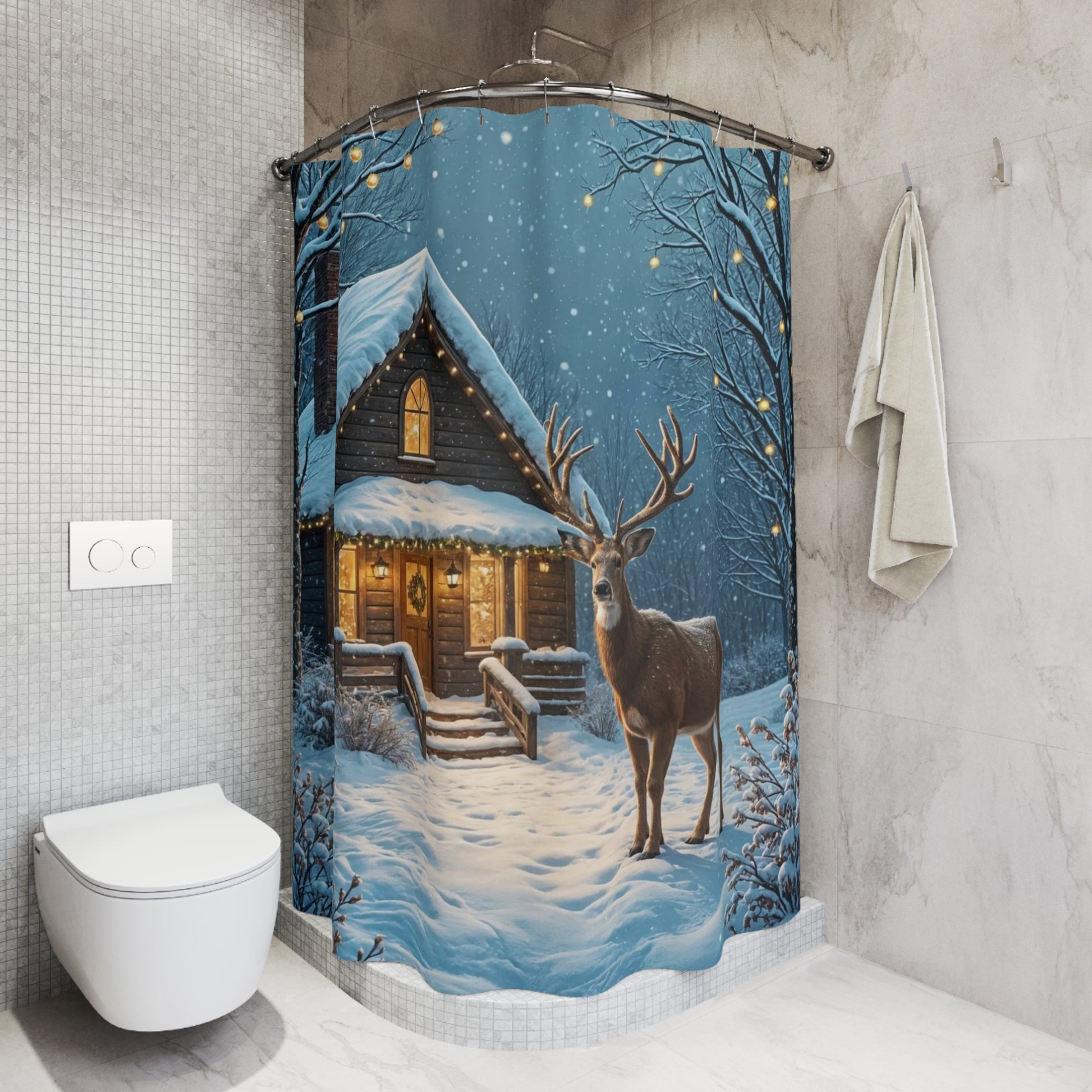 Transform your bathroom into a cozy winter retreat with this stunning shower curtain. Designed to evoke the enchanting atmosphere of a snowy evening, it features a picturesque scene of a charming cabin surrounded by twinkling lights and a majestic deer. This shower curtain brings warmth and charm to your space, making it perfect for those who love nature and winter aesthetics. Ideal for anyone looking to refresh their home decor, it’s especially relevant for the holiday season, family gatherings, or cozy winter nights. Whether you’re preparing for a festive celebration or simply want to enjoy the beauty of winter in your daily routine, this product fits seamlessly into your life, combining functionality with artistry.