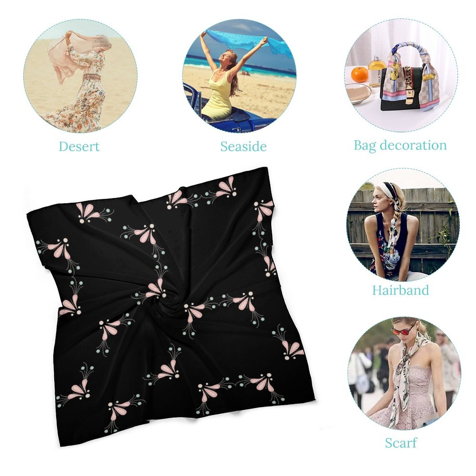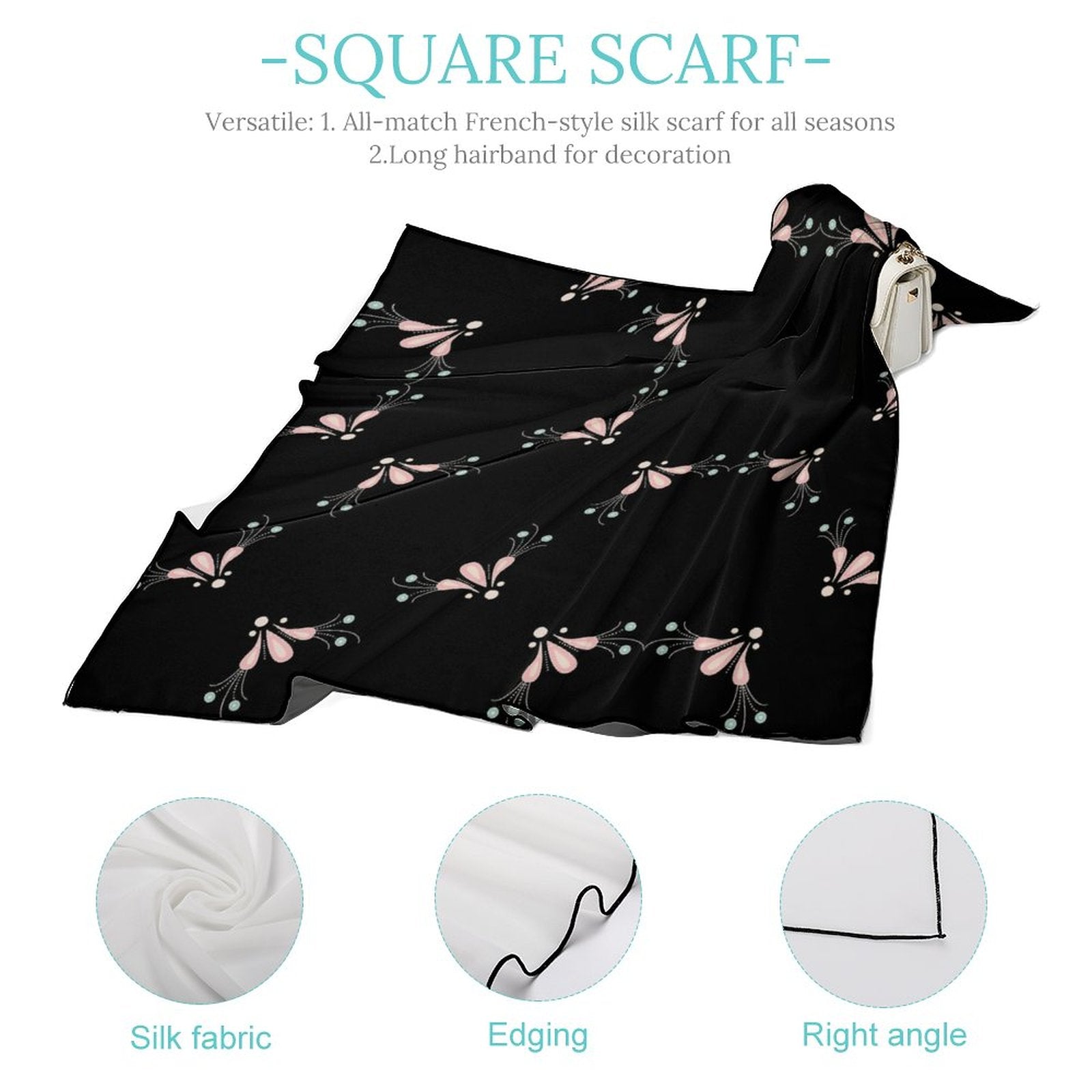 - Product Performance: The Women's Scarf is made of breathable, wrinkle-resistant and skin-friendly fabric, better than most satin scarf fabrics on the market. The Women's Scarf adopts precise hemming-stitch techniques, no jump needle and drop-off. The workmanship shows the texture of the product. The Women's Scarf offers different kinds of dressing ways. The Women's Scarf can be used as neckerchief, scarf bracelet, also head and hair band and so on. Also, the Women's Scarf can also be a decoration for leather bags, bamboo bags, paper bags, etc.